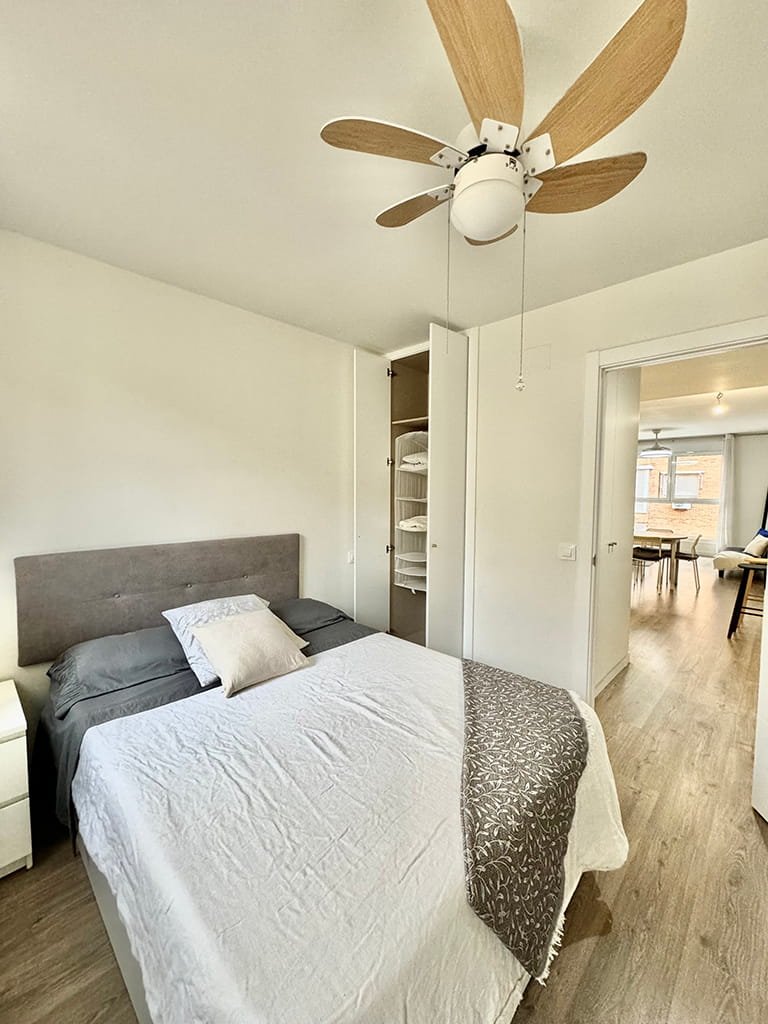 El dormitorio tiene una cama doble de 130*190 centímetros, donde podrás guardar lo necesario, también un armario empotrado.