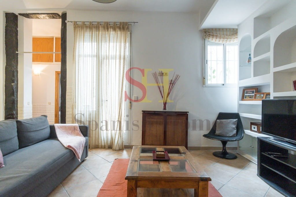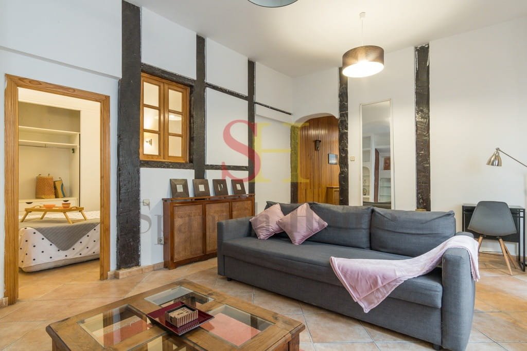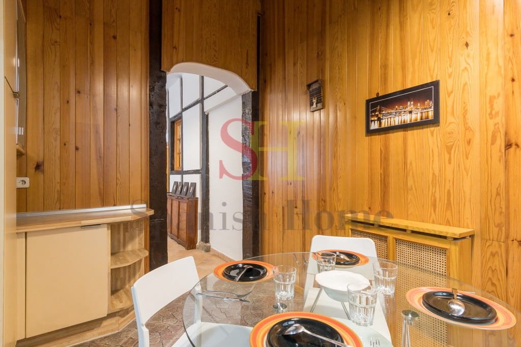 El apartamento presenta un estilo ecléctico lleno de carácter, con suelos de baldosas y vigas de madera vistas que aportan personalidad y encanto al espacio.