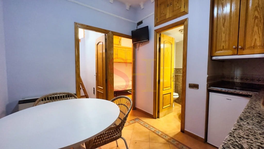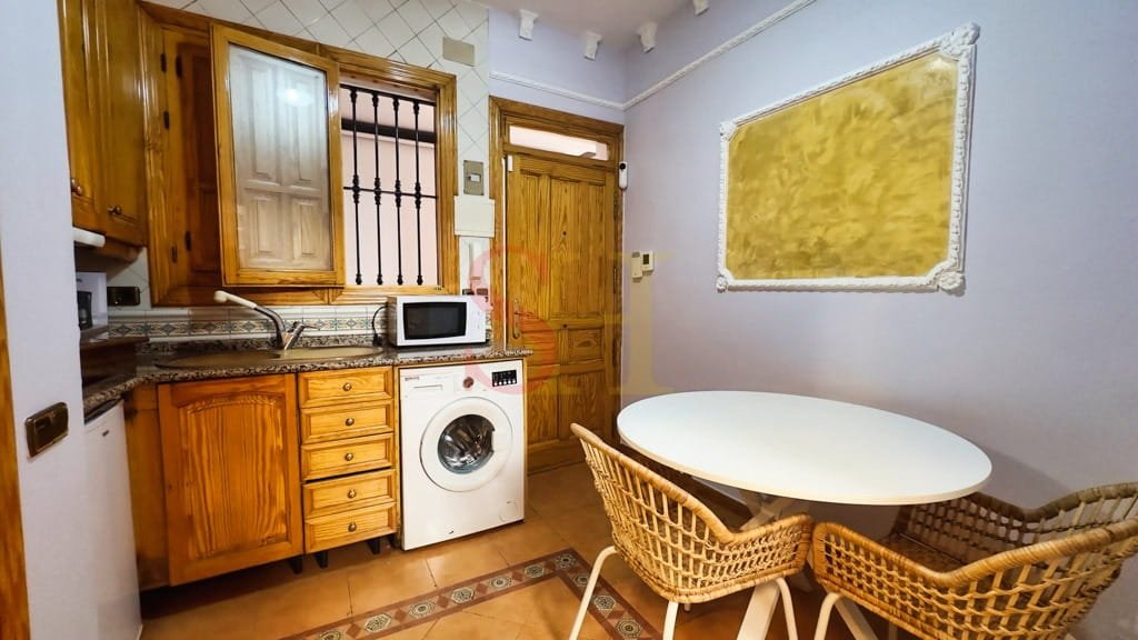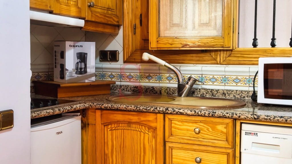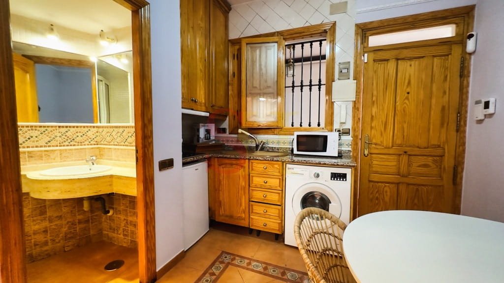 La cocina es de estilo americano y está equipada con placa vitrocerámica, frigorífico, lavadora, campana extractora y menaje básico, ofreciendo todo lo necesario para preparar tus comidas con comodidad.