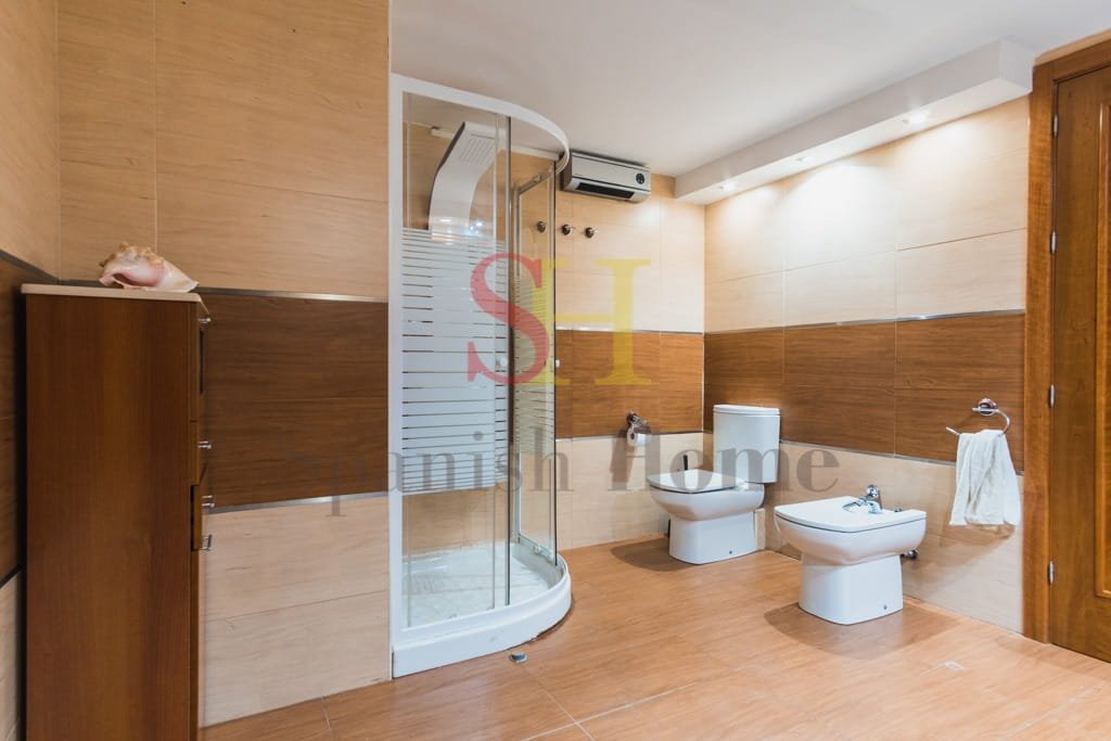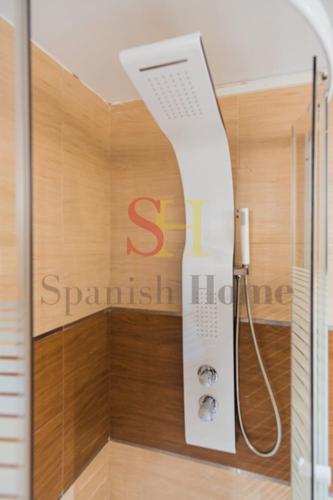 El baño es amplio y elegante, con una ducha moderna y una iluminación cuidadosamente diseñada que aporta un ambiente agradable y relajante.