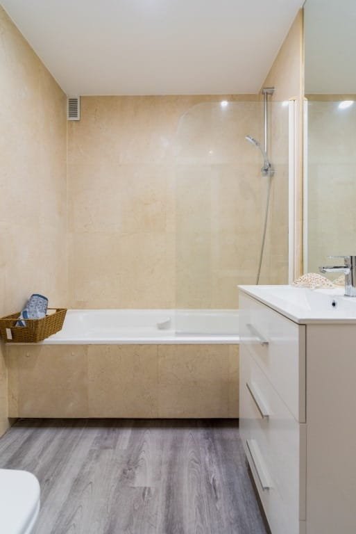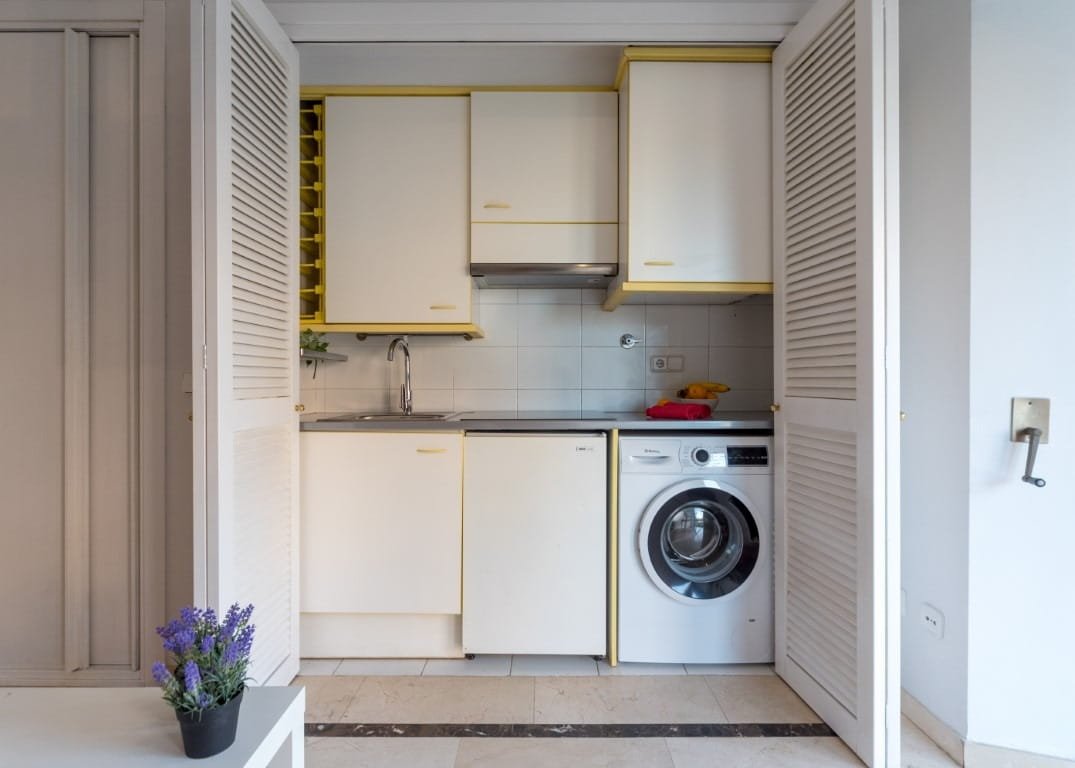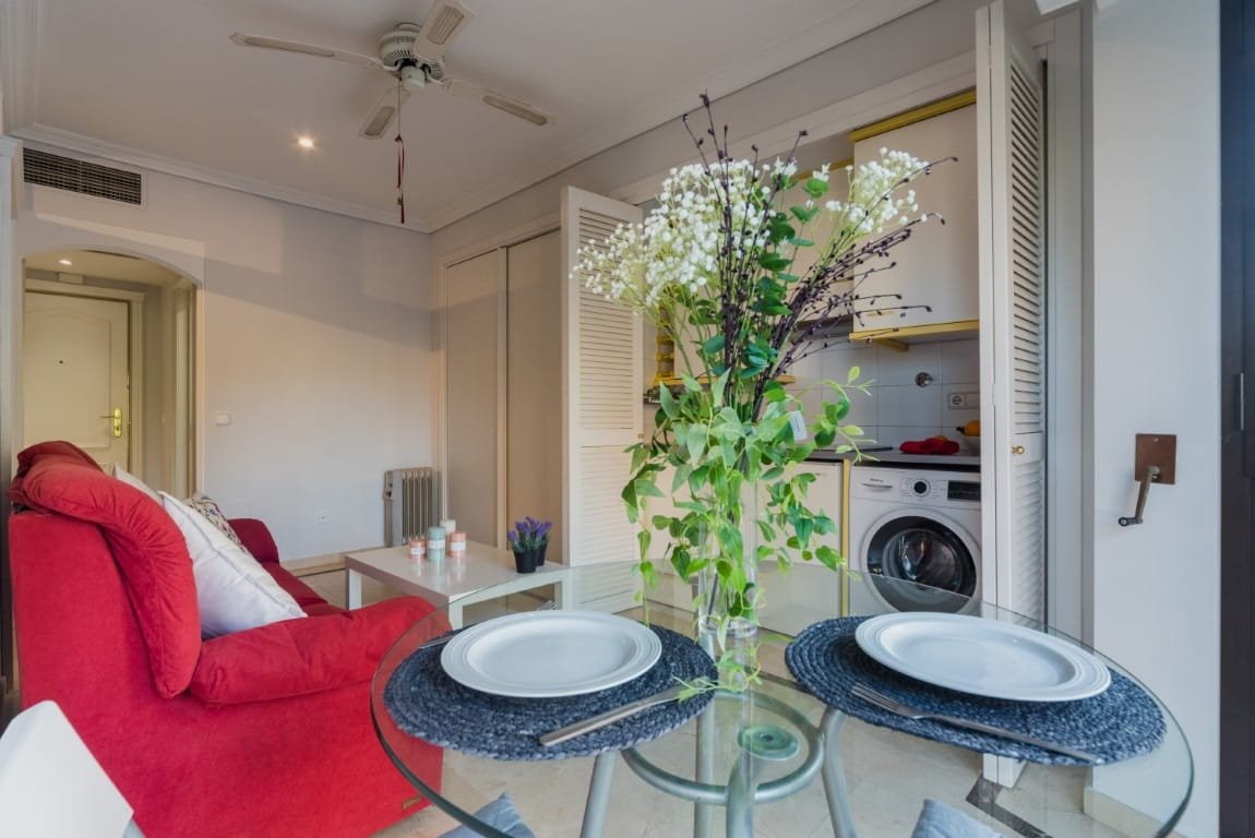 El salón-comedor es cómodo y funcional, con mesa circular y una cocina empotrada con puertas corredizas, ideal para mantener el espacio ordenado y ocultar la cocina cuando recibes visitas. El baño es amplio y acogedor, con vestidor que añade practicidad y espacio de almacenamiento.