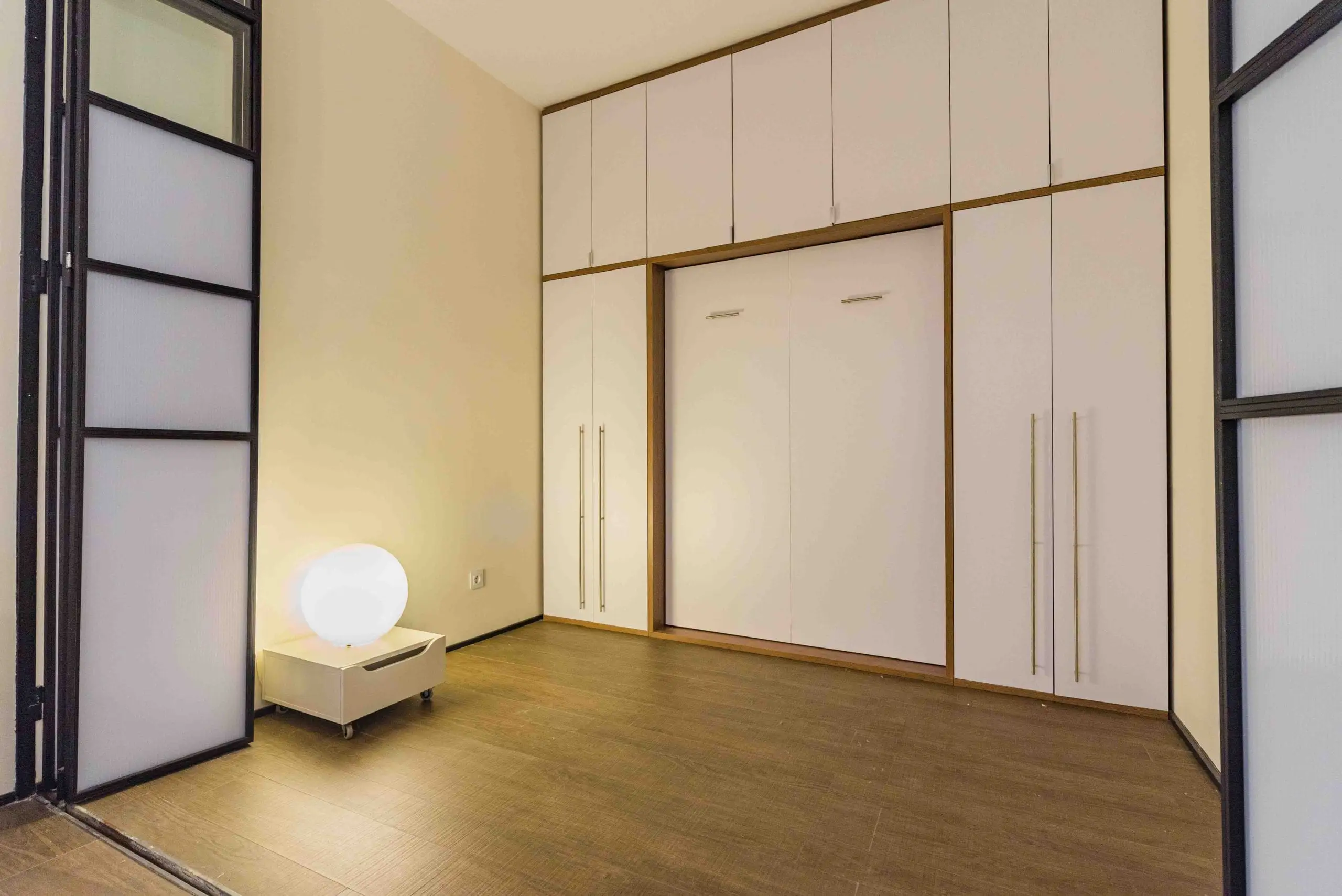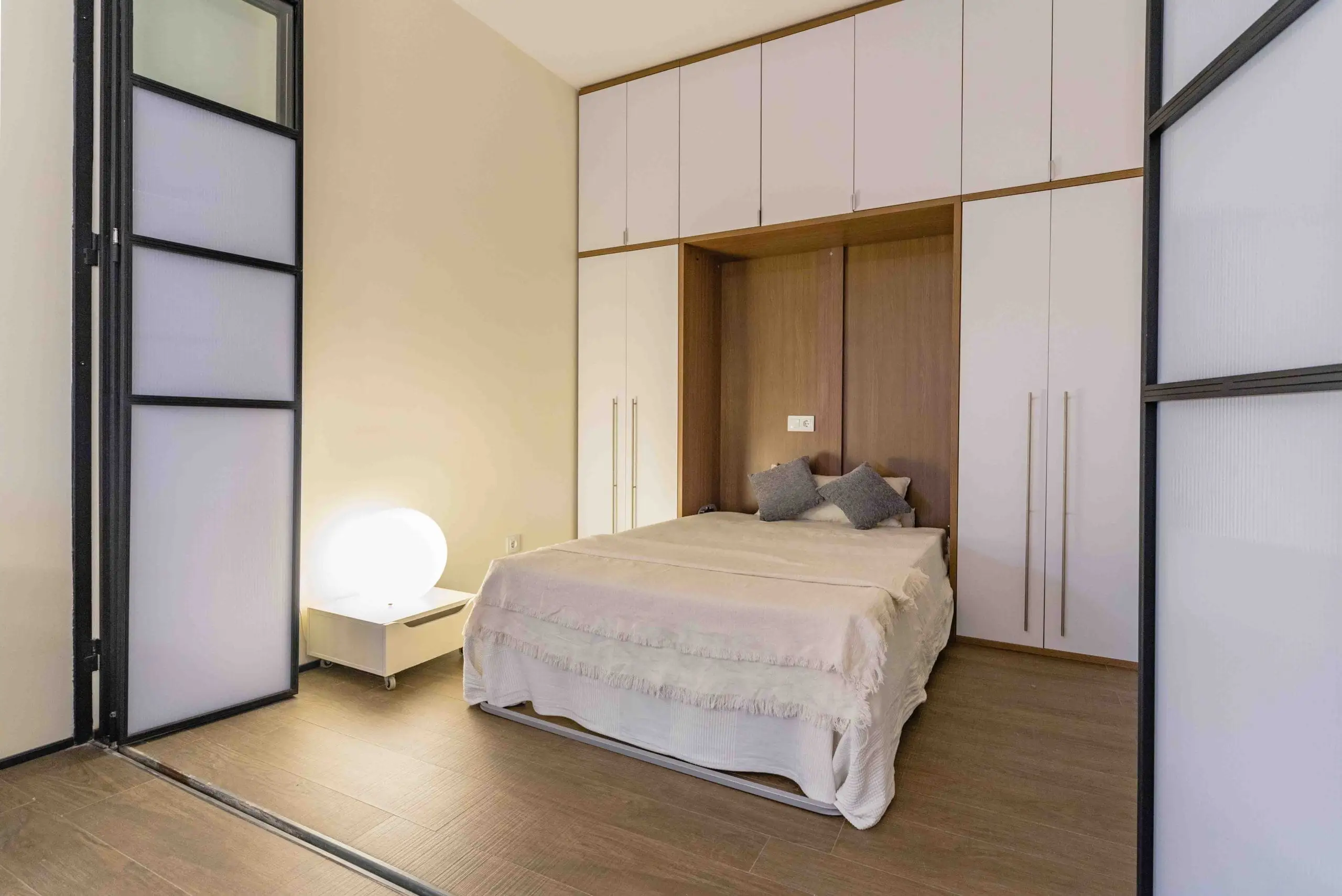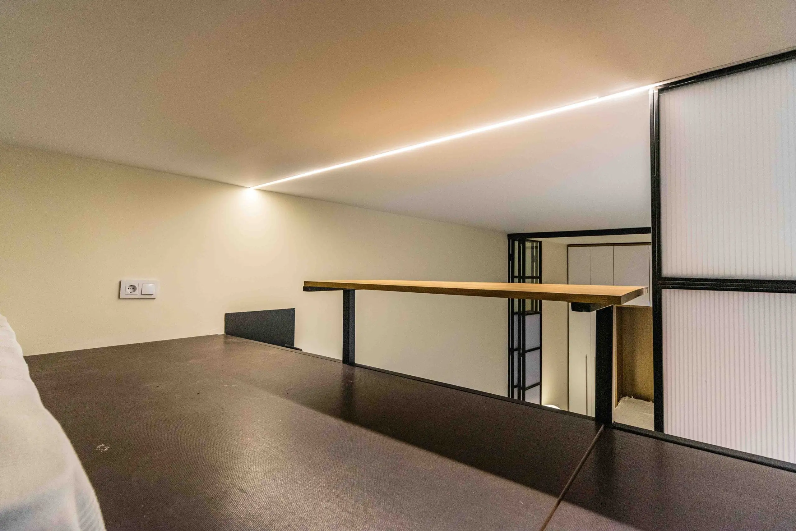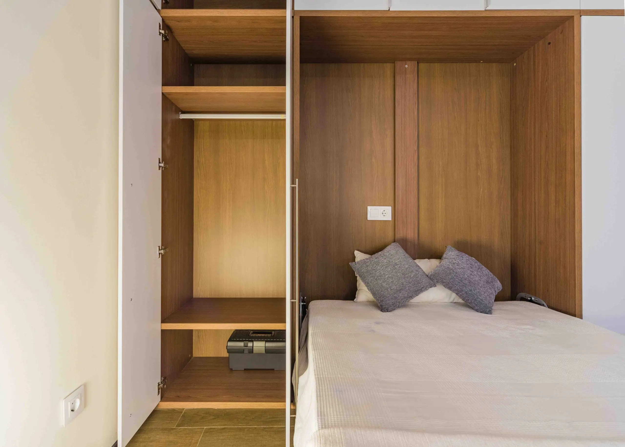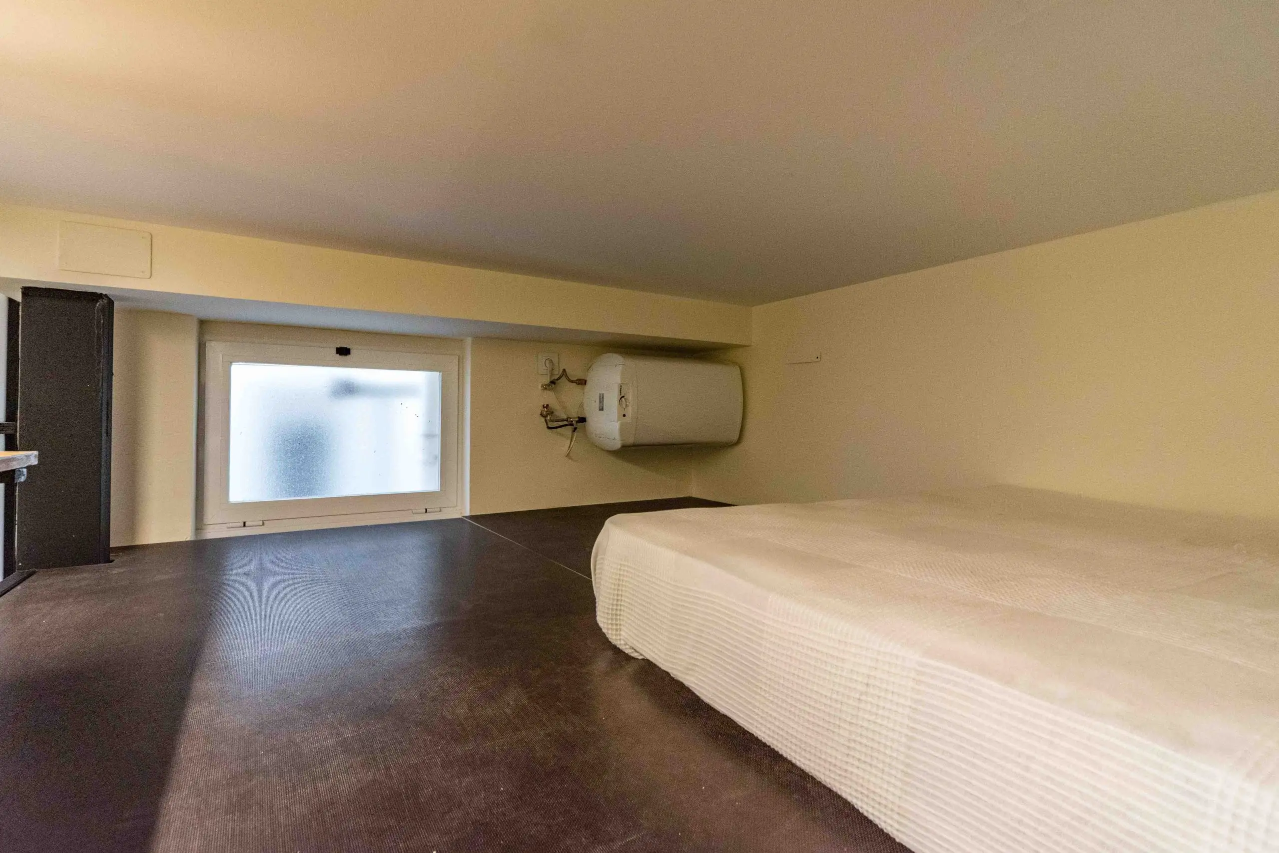 The apartment features a separate bedroom with a double bed and a spacious built-in wardrobe designed to maximize storage. Above, you’ll also find a practical loft area with an additional double mattress — perfect for hosting guests or creating a cozy extra sleeping space.