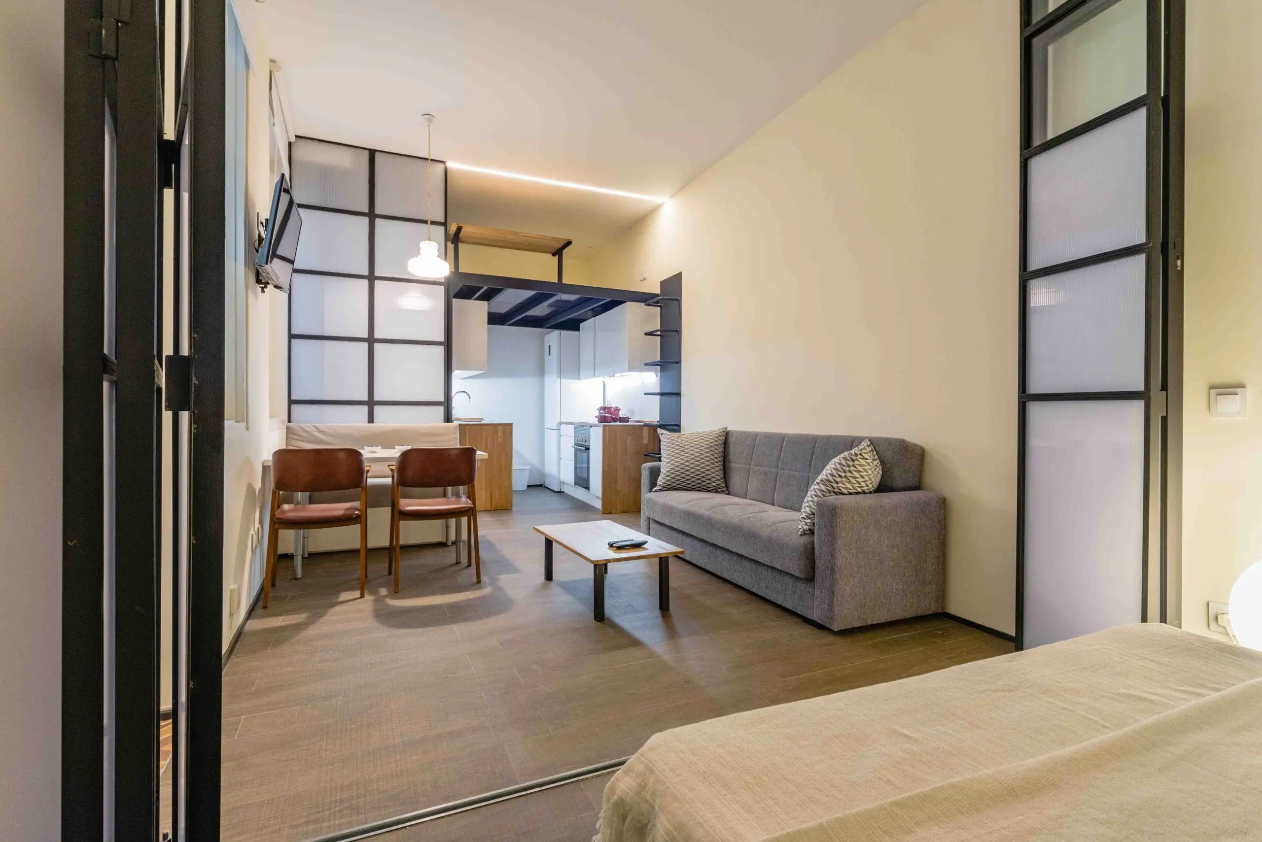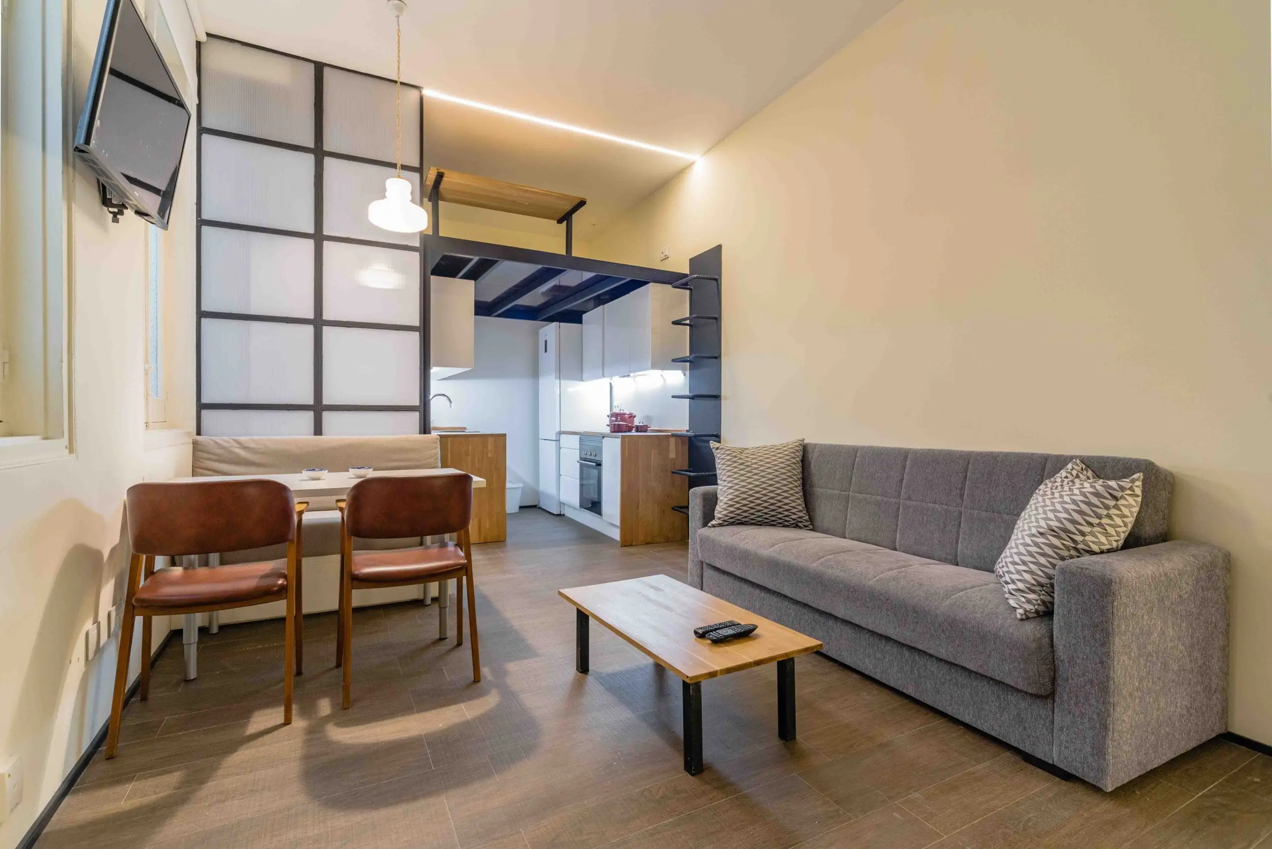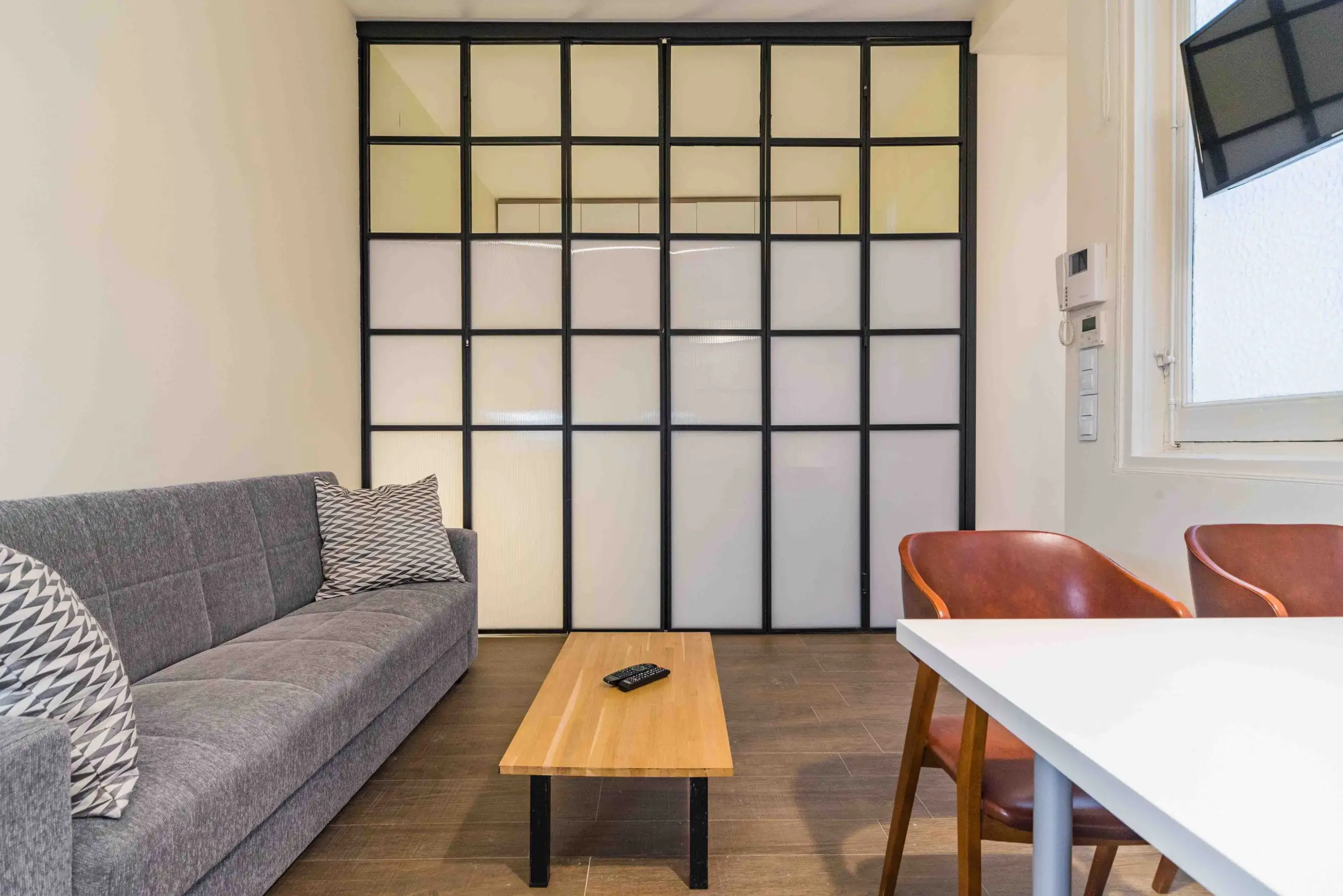 The living room is warm and inviting, featuring a comfortable sofa bed and television, making it the perfect place to relax after a day exploring the city. Large windows bring in plenty of natural light and fresh air. Adjacent to the living area is a dining space that seats four people, ideal for enjoying meals with friends or family.
