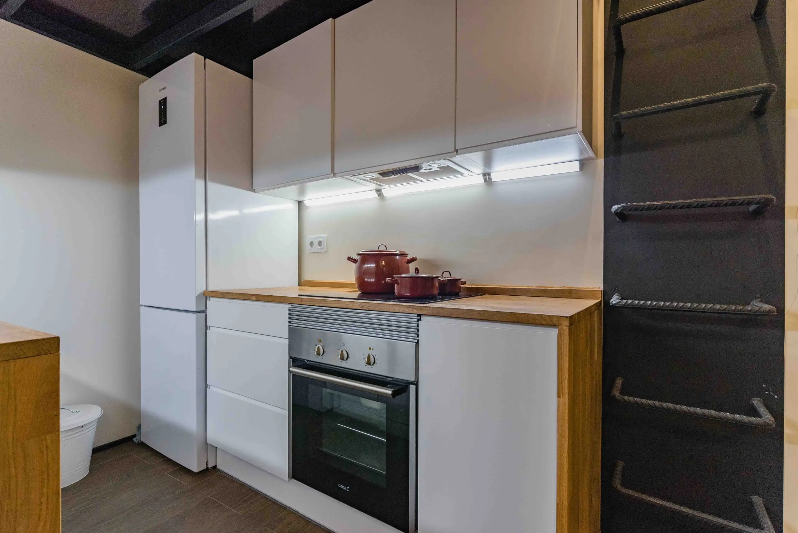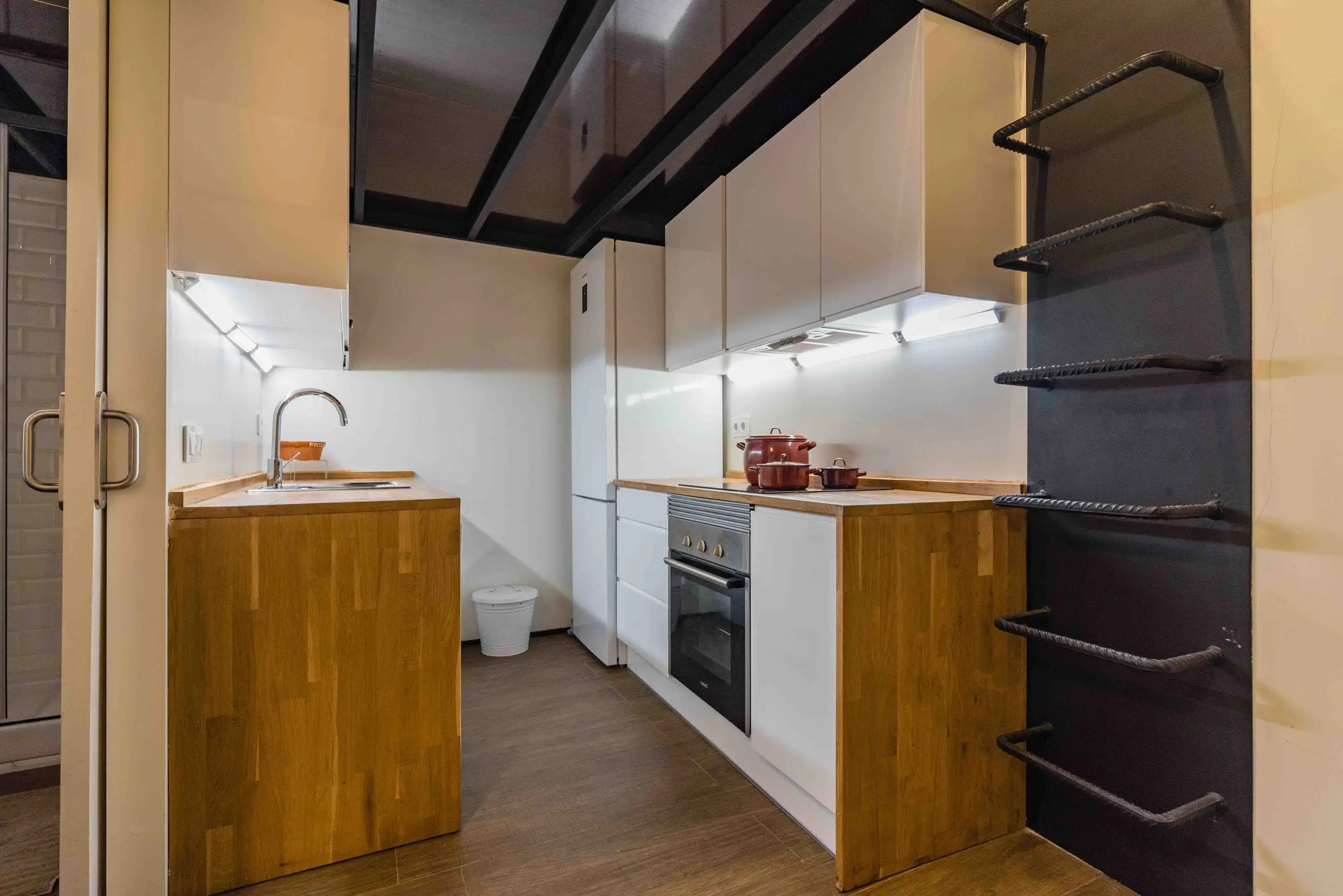 El baño presenta un diseño moderno y funcional con una amplia ducha, mientras que la cocina está equipada con electrodomésticos modernos y ofrece un espacio práctico y agradable para cocinar.