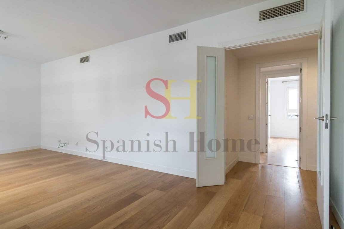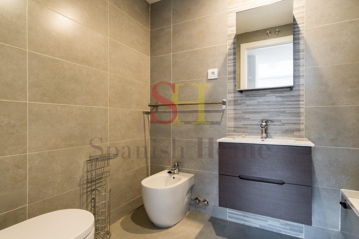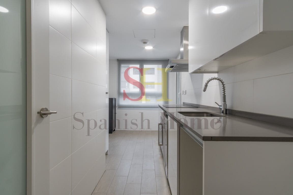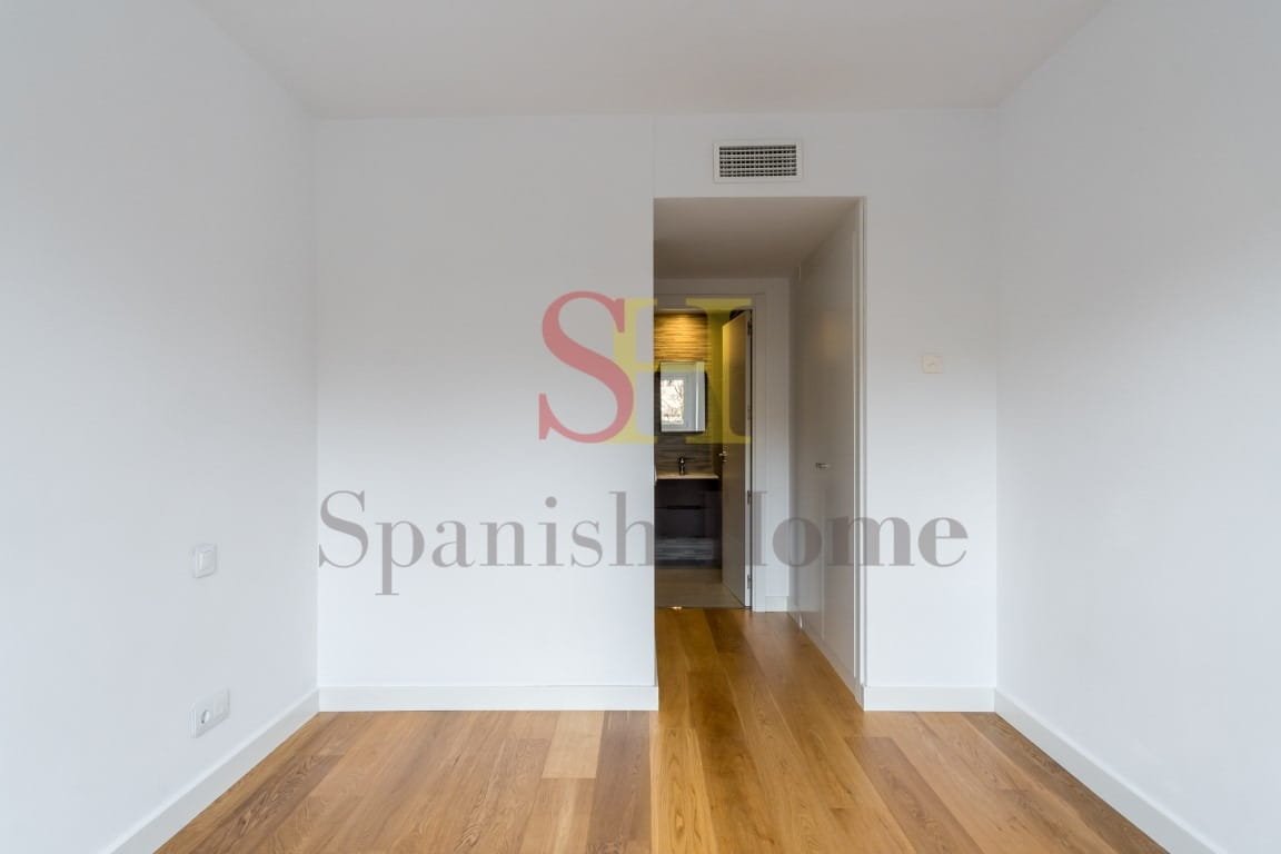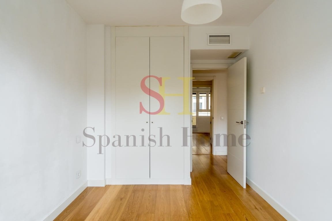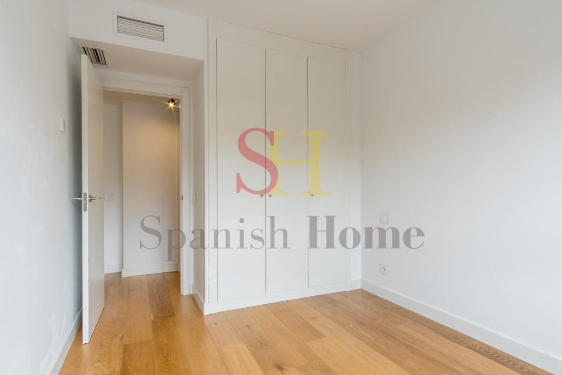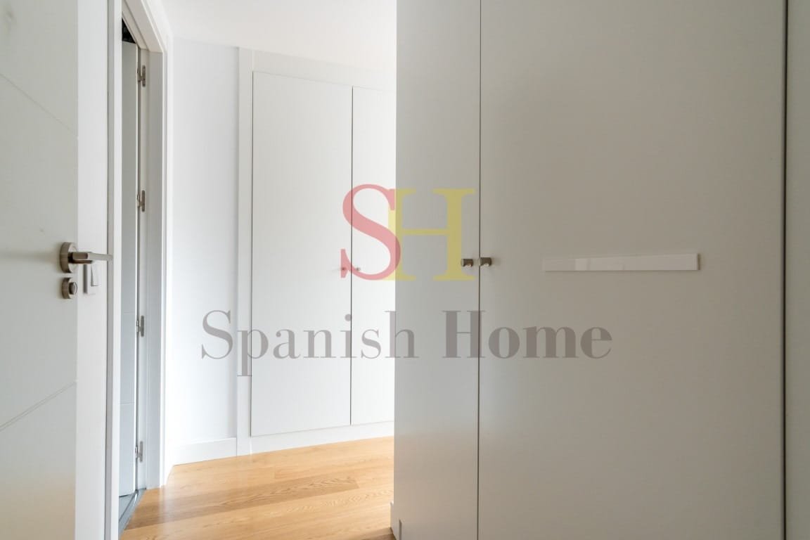 El piso cuenta con tres dormitorios y dos baños, siendo el dormitorio principal en suite, con baño privado que dispone de bañera. Todos los dormitorios cuentan con armarios empotrados lacados en blanco, ofreciendo un diseño limpio y funcional con gran capacidad de almacenamiento.