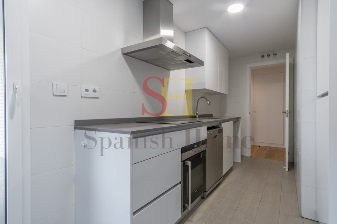 La cocina está totalmente equipada con electrodomésticos como placa de vitrocerámica, horno, lavavajillas y campana extractora. Los baños son modernos y funcionales, uno de ellos con bañera.