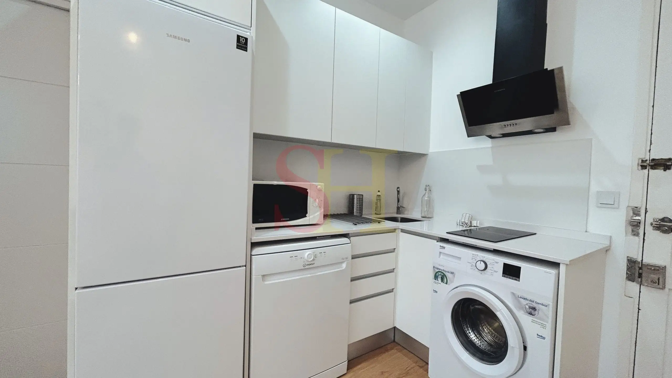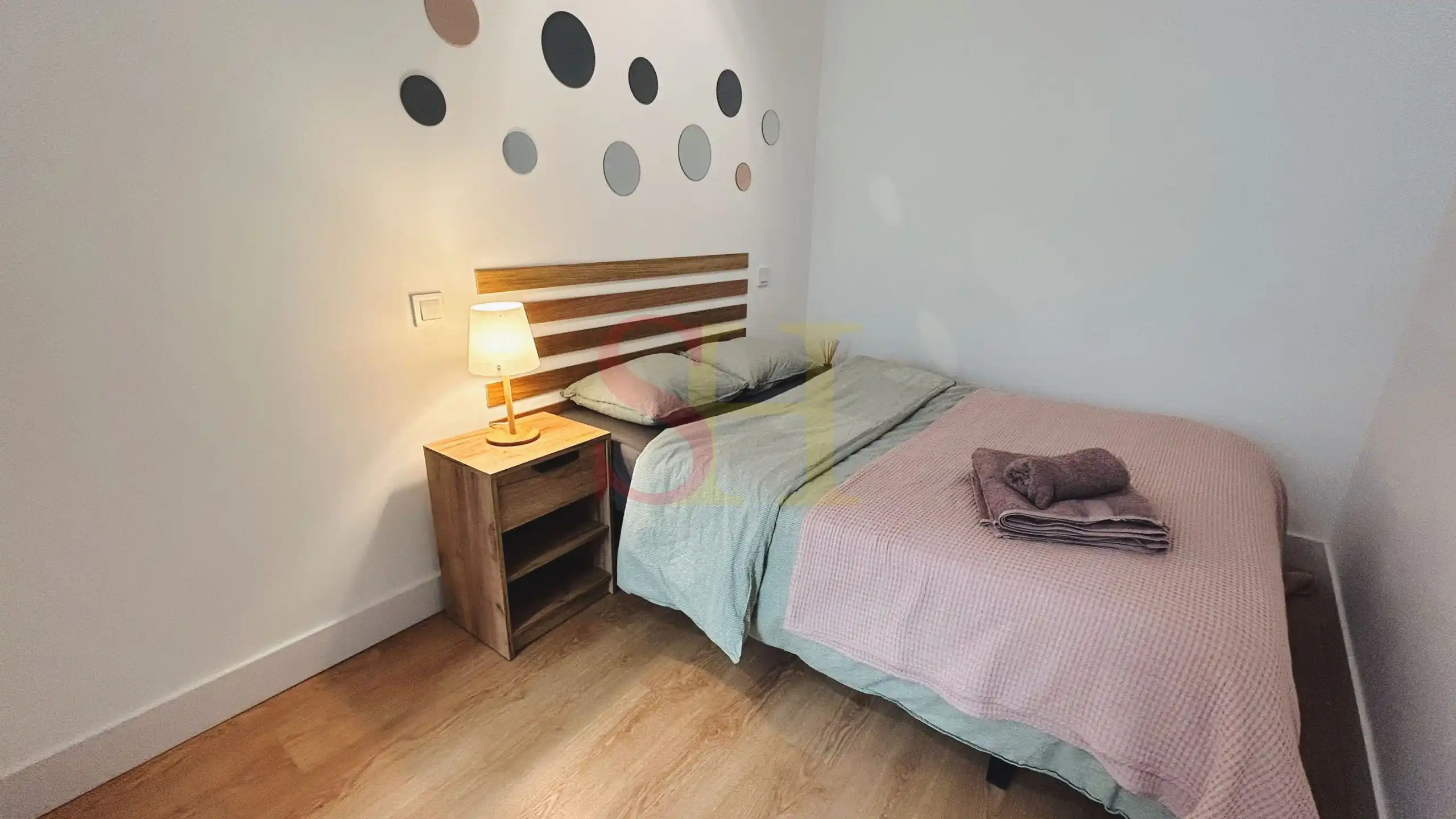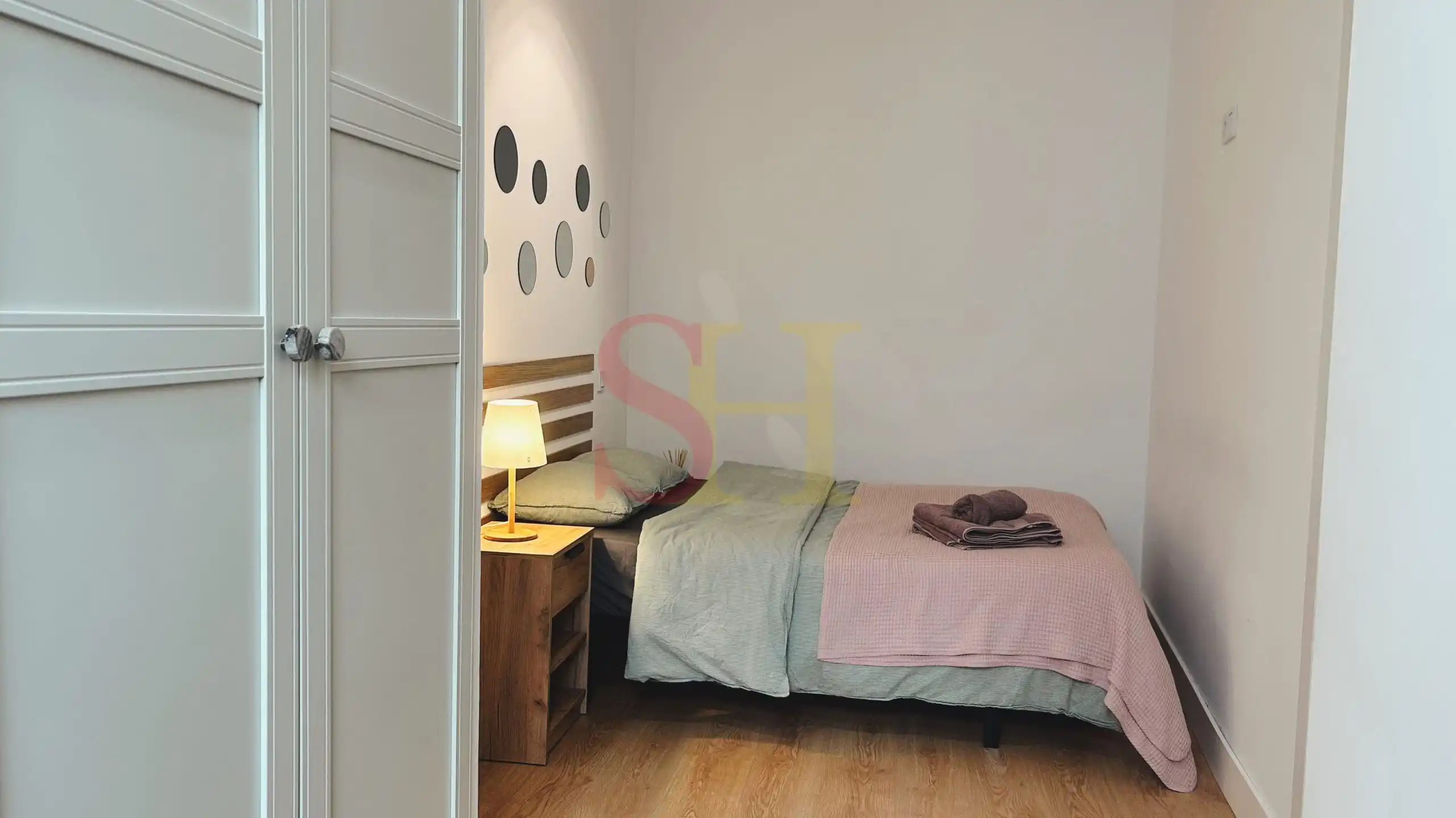 En el pasillo que da acceso al dormitorio encontrarás un amplio armario empotrado. El dormitorio cuenta con una cama de 135 x 190 cm, ideal para el descanso. El baño es moderno y funcional, con plato de ducha, mampara y un práctico mueble para organizar tus objetos personales.