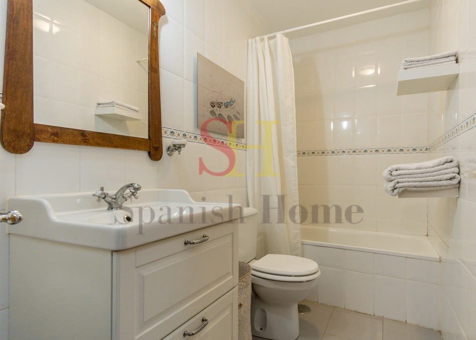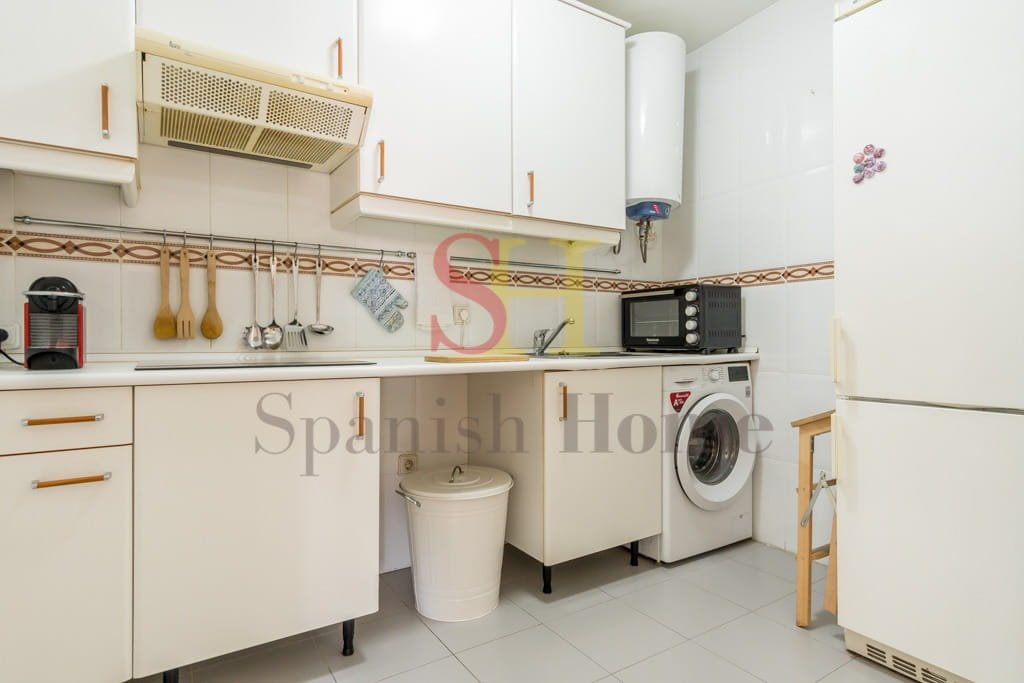 La cocina está completamente equipada con una nevera amplia, lavadora, vitrocerámica y menaje básico, facilitando la preparación de tus comidas diarias.
