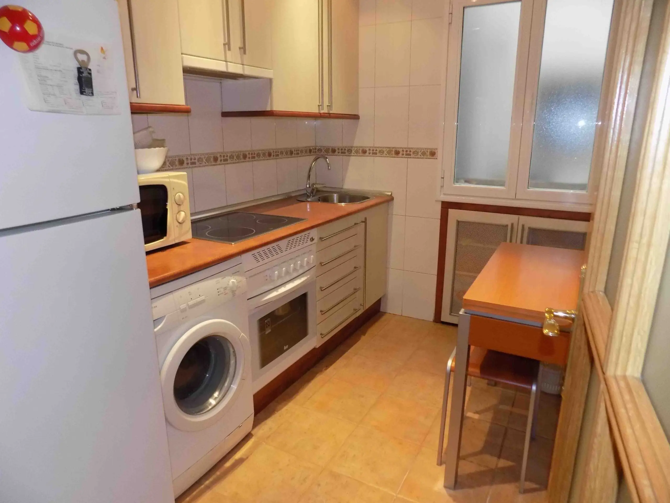 La cocina está totalmente equipada con electrodomésticos y menaje, lista para que prepares tus comidas con total facilidad. El salón, acogedor y funcional, dispone de un cómodo sofá y una mesa de comedor para tres o cuatro personas, creando un ambiente perfecto para relajarte o compartir momentos con amigos.
