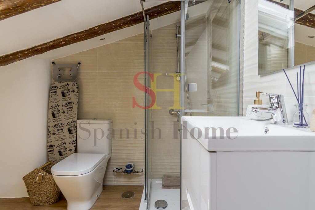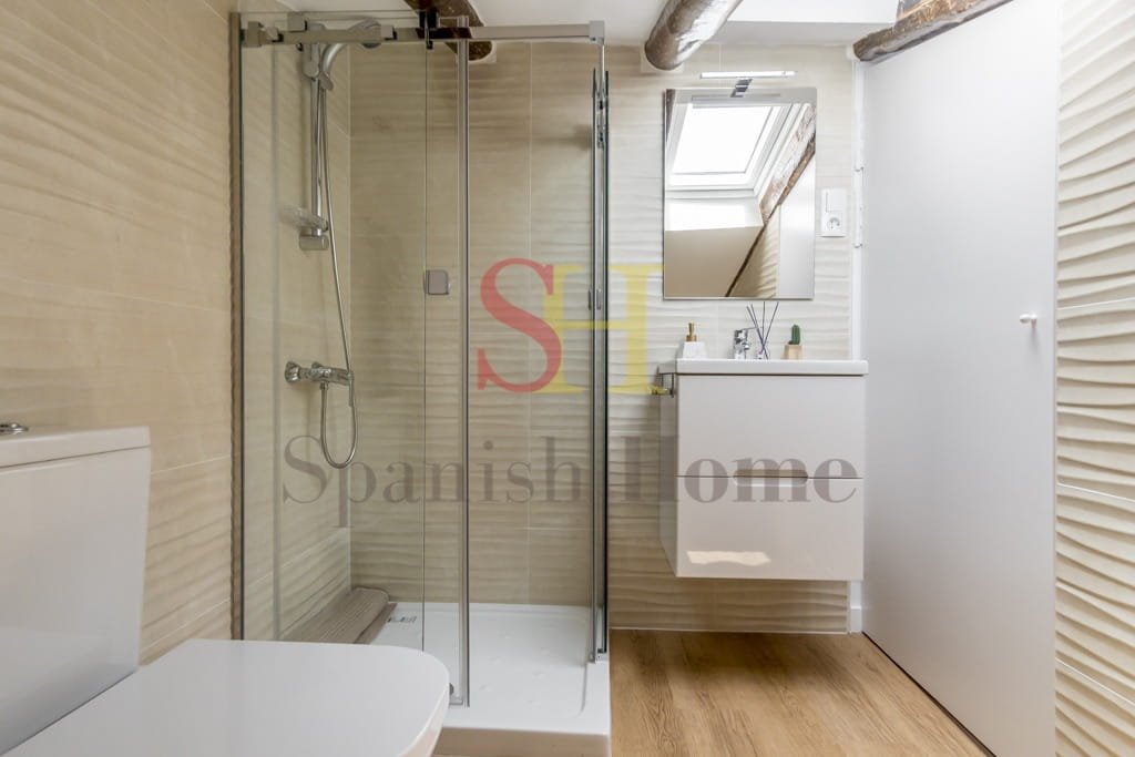 El dormitorio es cómodo y luminoso, y dispone de un amplio armario empotrado que facilita el almacenamiento. El baño es privado, con plato de ducha y un elegante espejo moderno con iluminación integrada que aporta estilo y funcionalidad.