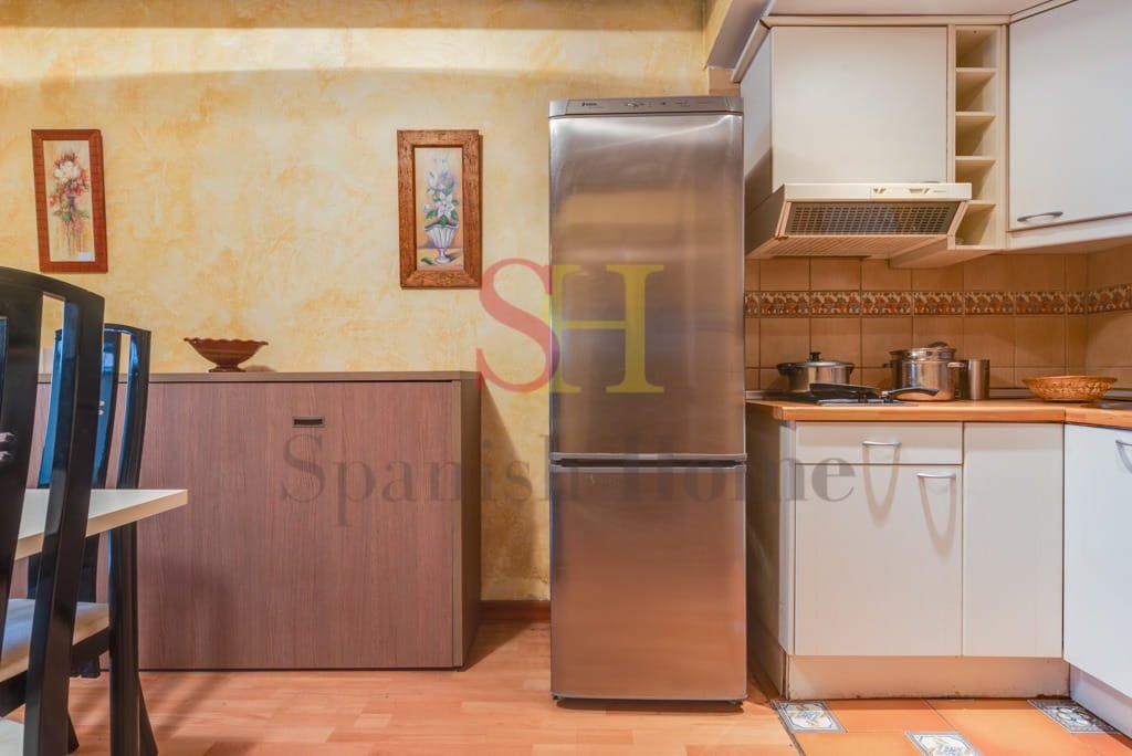 The living room is spacious and bright, with excellent airflow. It includes a comfortable sofa and an extra bed for guests, as well as a dining table that can accommodate up to four people. The open-plan kitchen is equipped with appliances and kitchenware, providing everything needed for a comfortable temporary stay in Madrid.