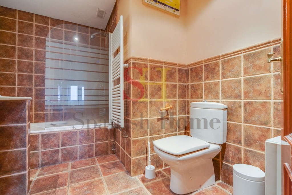 El baño es amplio y moderno, con bañera con ducha y un elegante lavabo que aporta estilo y funcionalidad al espacio.