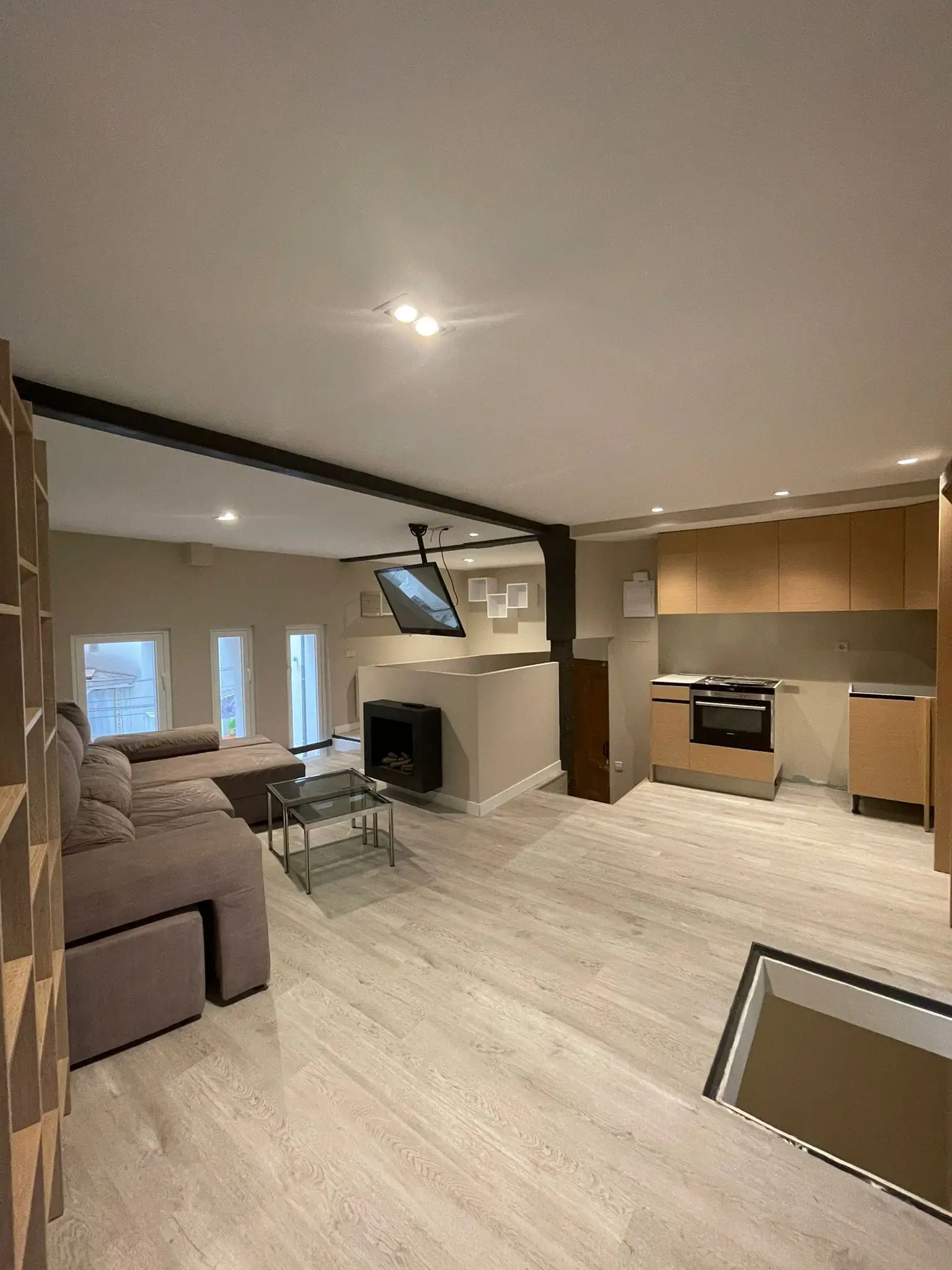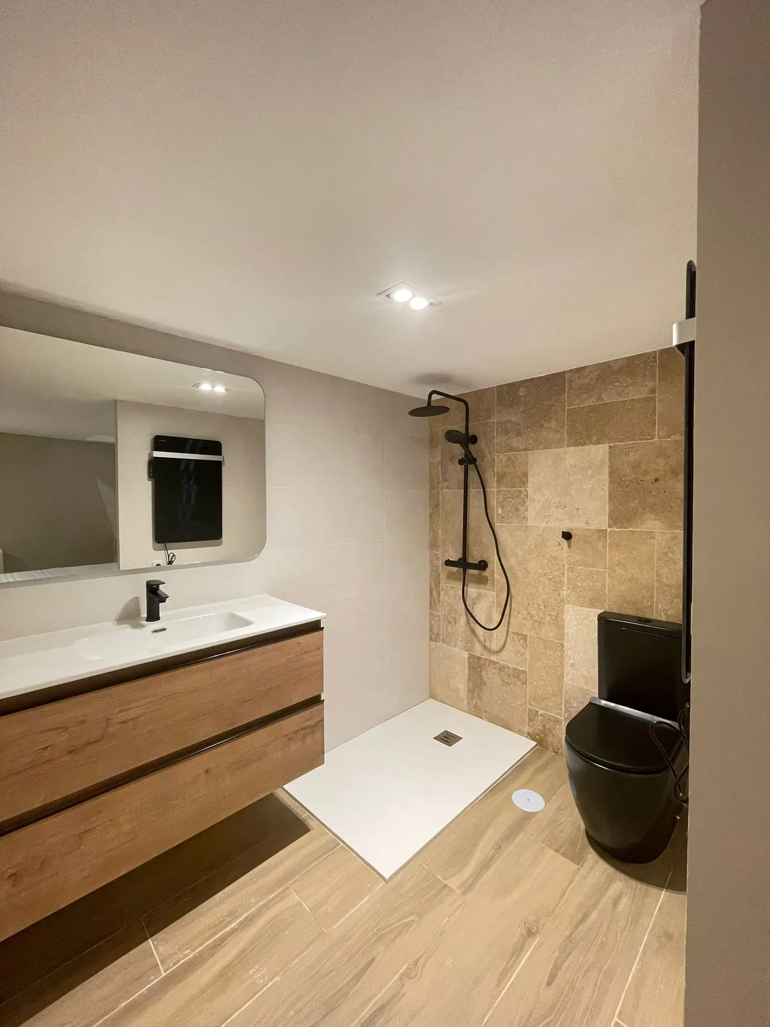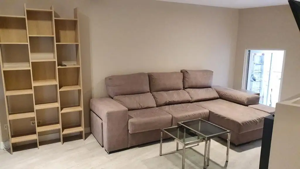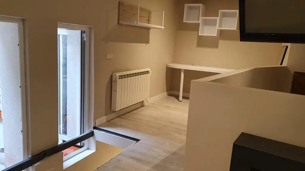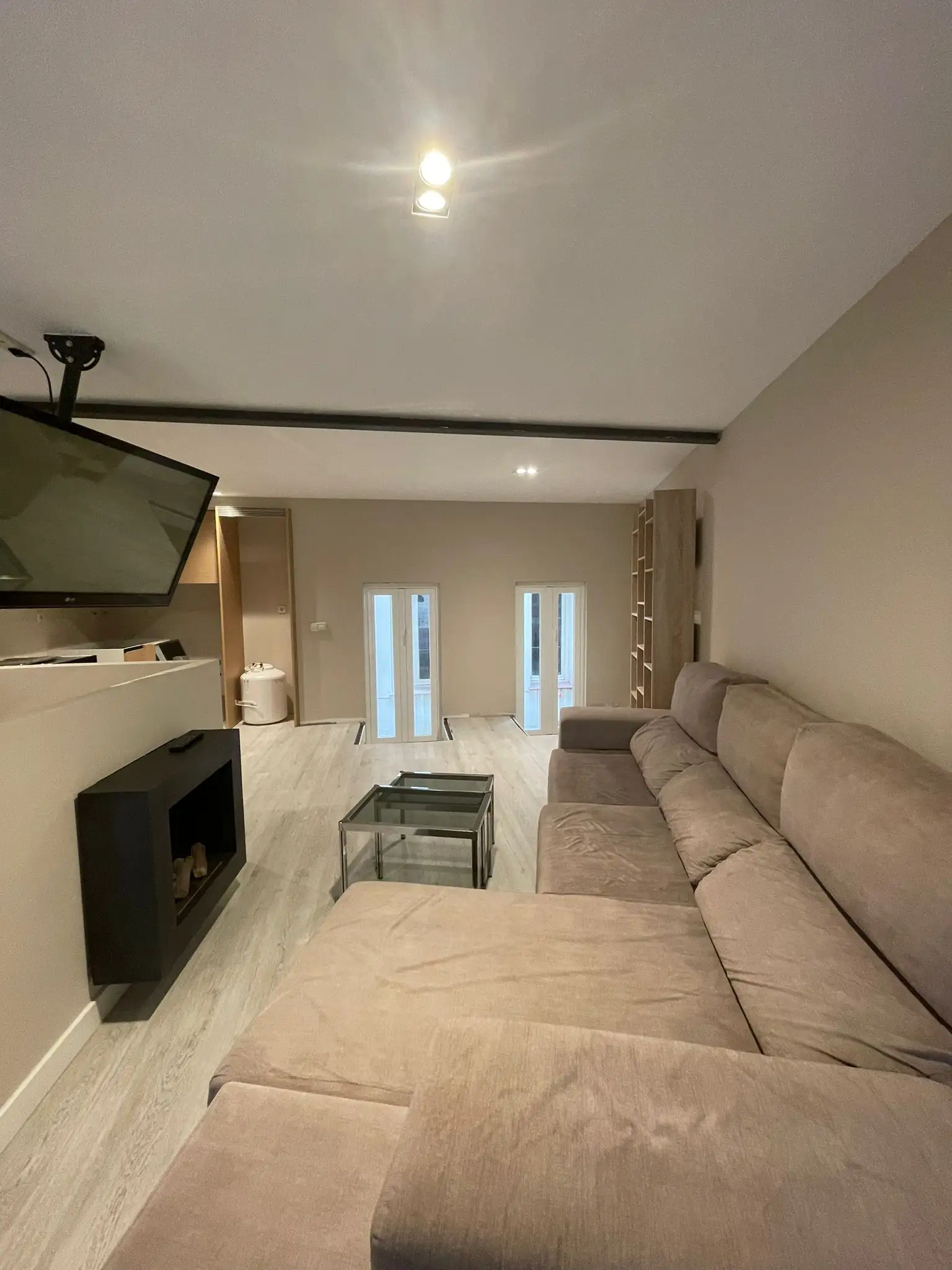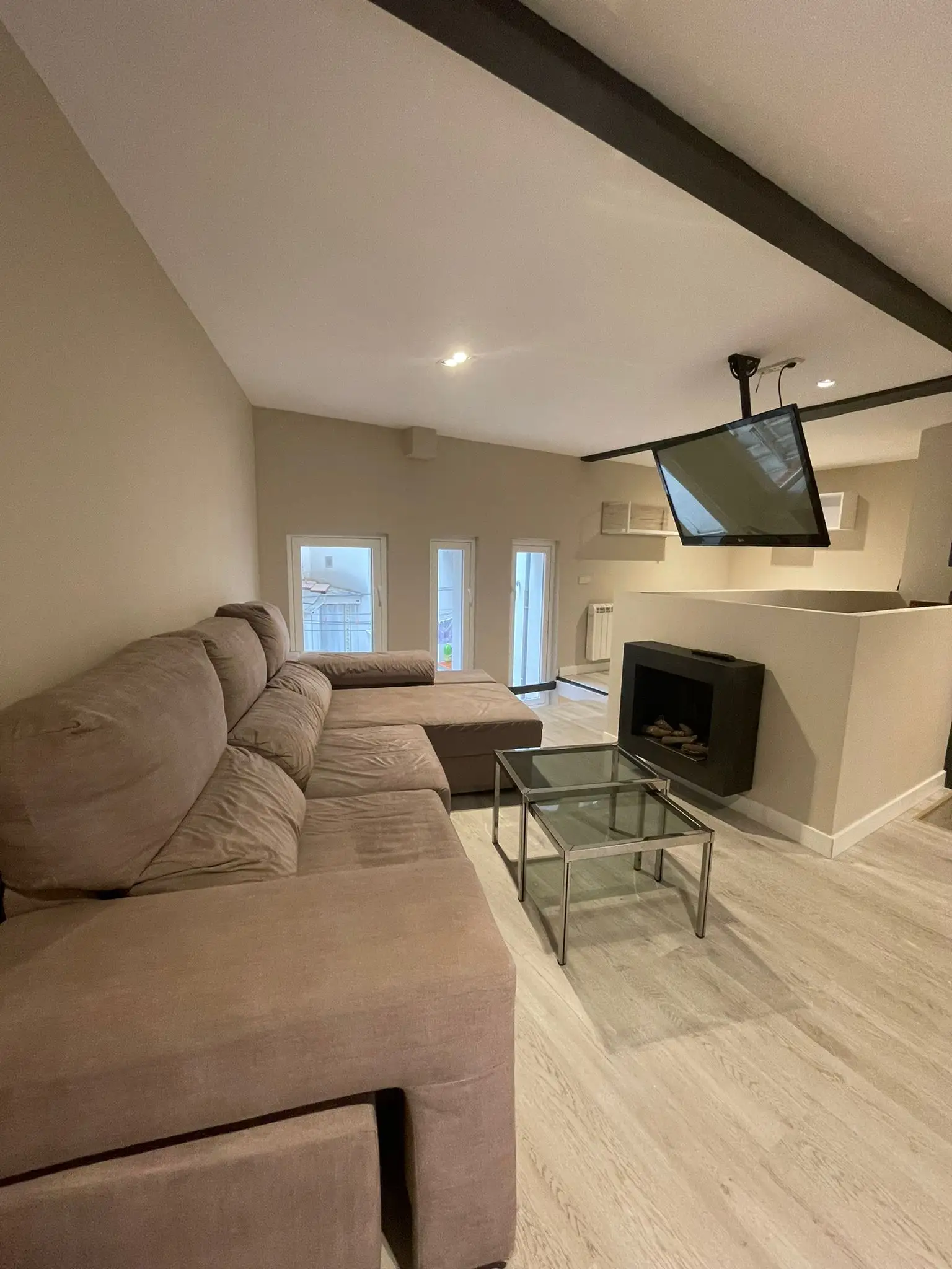 El salón es amplio, moderno y muy acogedor, equipado con un cómodo sofá chaise longue, televisión empotrada y un espacio ideal para estudio u oficina. Además, el apartamento dispone de calefacción eléctrica, aire acondicionado y una elegante chimenea de alcohol que aporta un toque cálido y sofisticado al ambiente.
