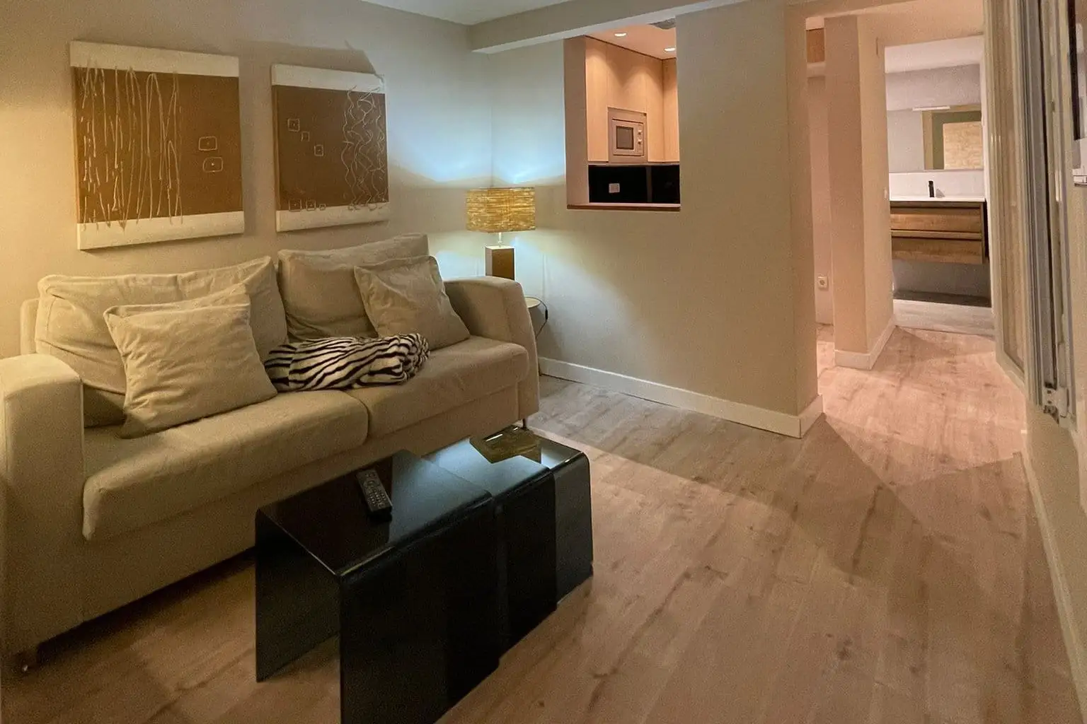 El salón es acogedor y funcional, equipado con un cómodo sofá-cama perfecto para recibir visitas o relajarte mientras disfrutas de una película después de un día en la ciudad.