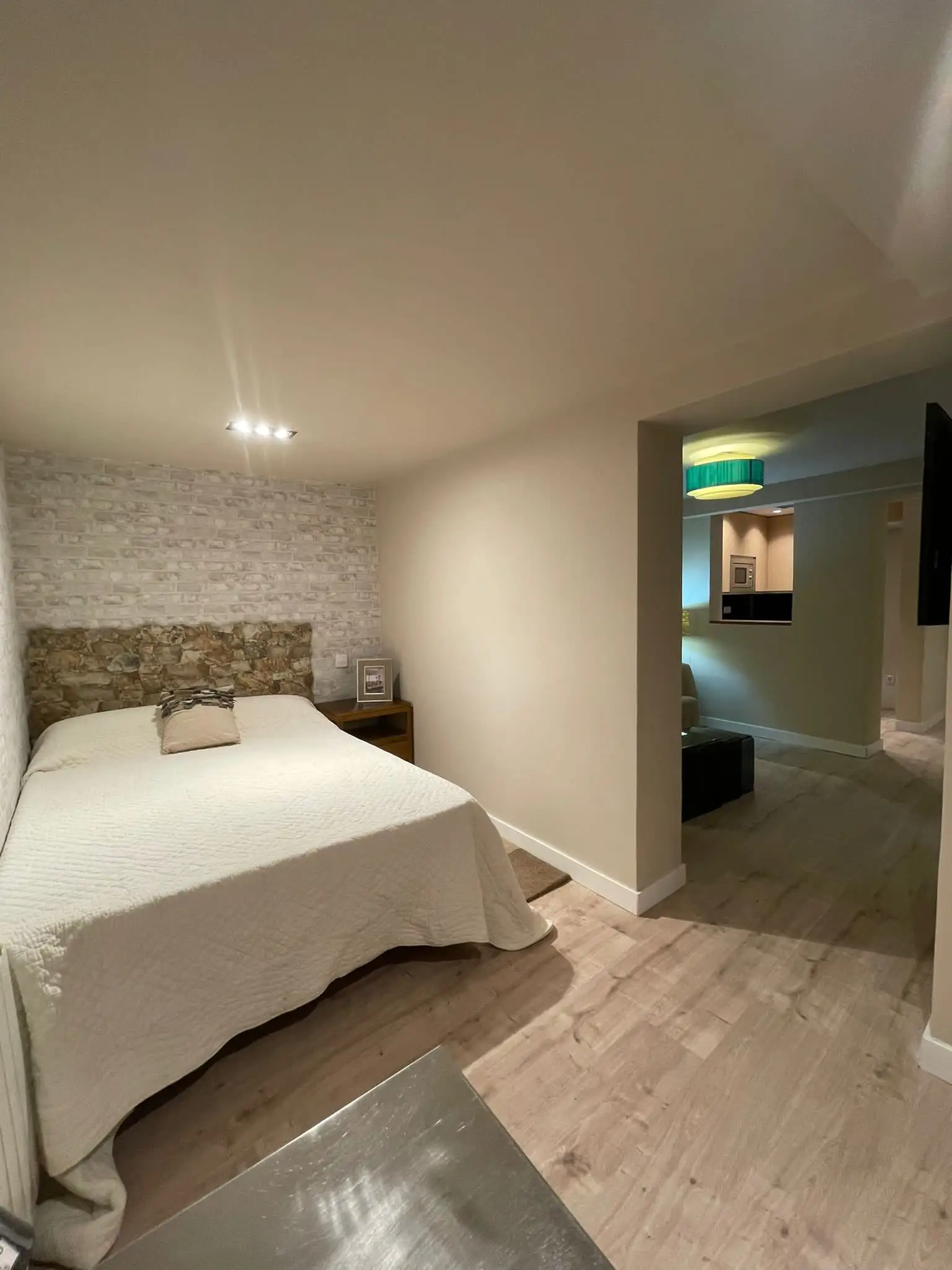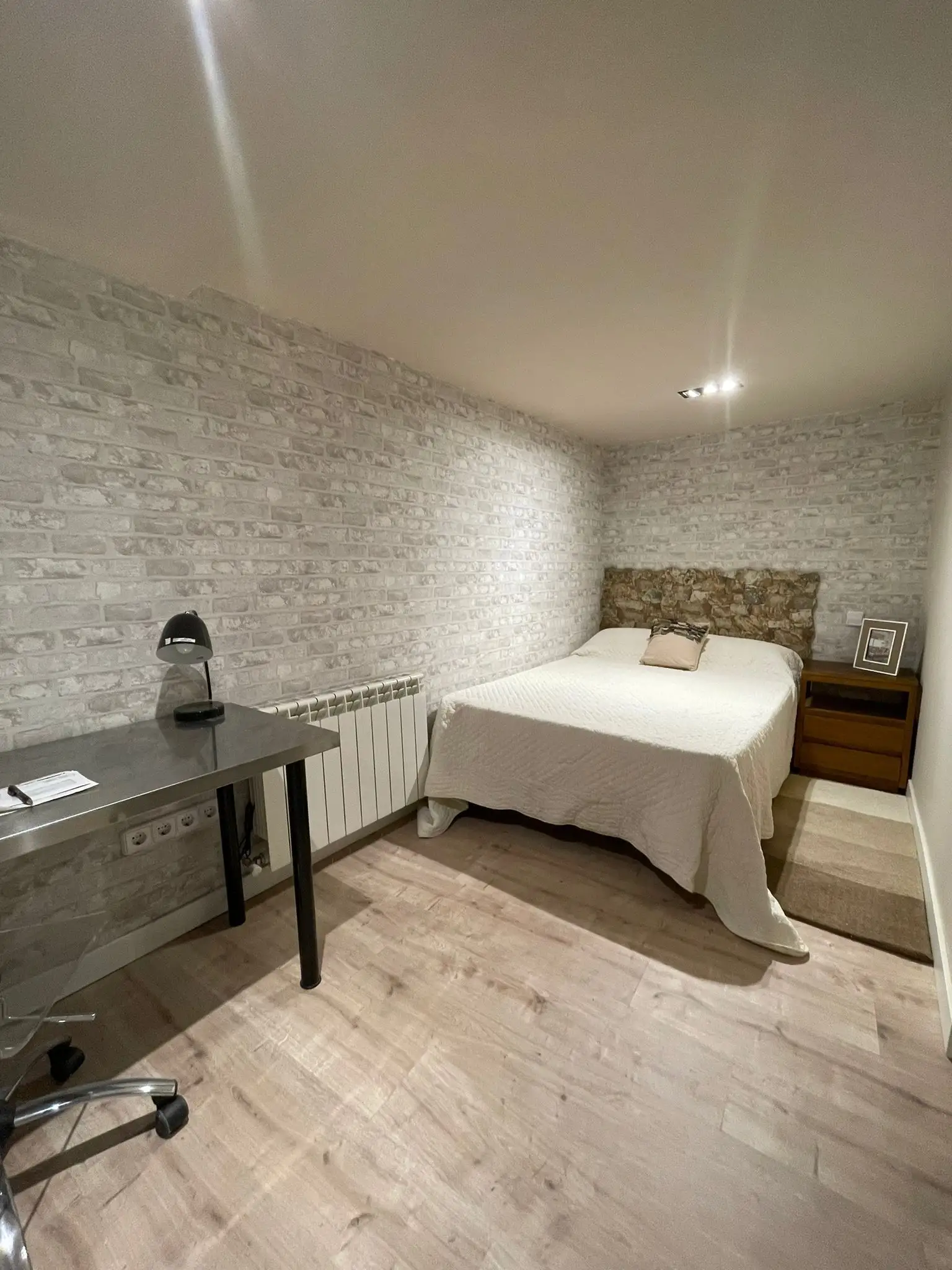 The property includes one bedroom, ideal for a couple or for people moving to Madrid for work or study. It features a 135 × 190 double bed, bedside table, and a practical desk that makes it easy to work or study from home.