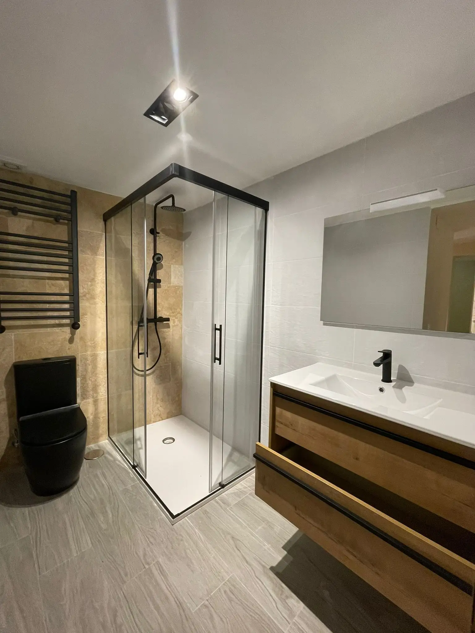El baño cuenta con un amplio plato de ducha, moderno y práctico.