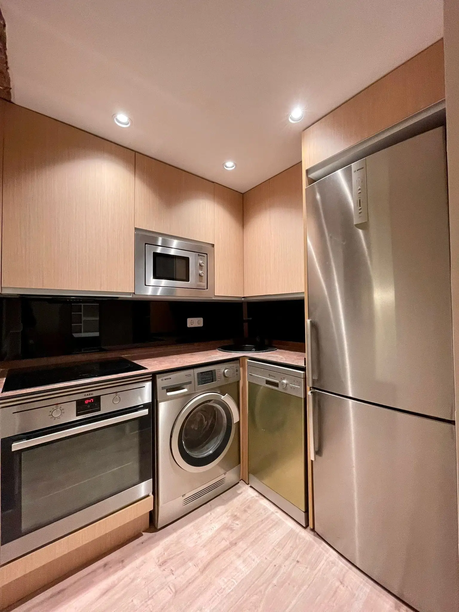 The kitchen has been fully renovated and includes a ceramic cooktop, oven, dishwasher, large refrigerator, and stainless-steel extractor hood, providing everything you need for daily living.