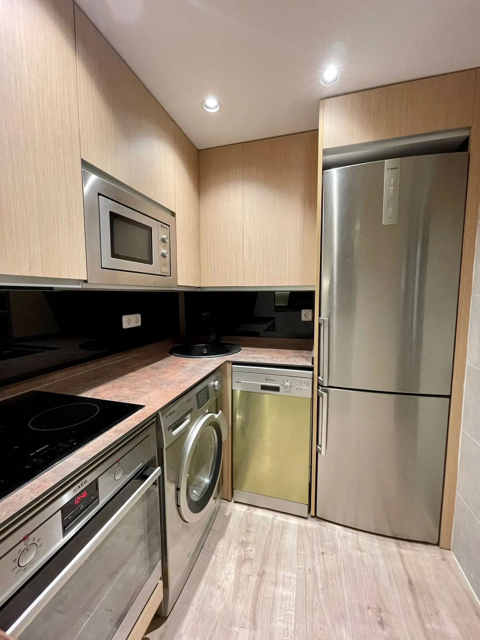 La cocina, completamente reformada, está equipada con vitrocerámica, horno, lavavajillas, una nevera grande y extractor de acero inoxidable, ofreciendo todo lo necesario para tu día a día.