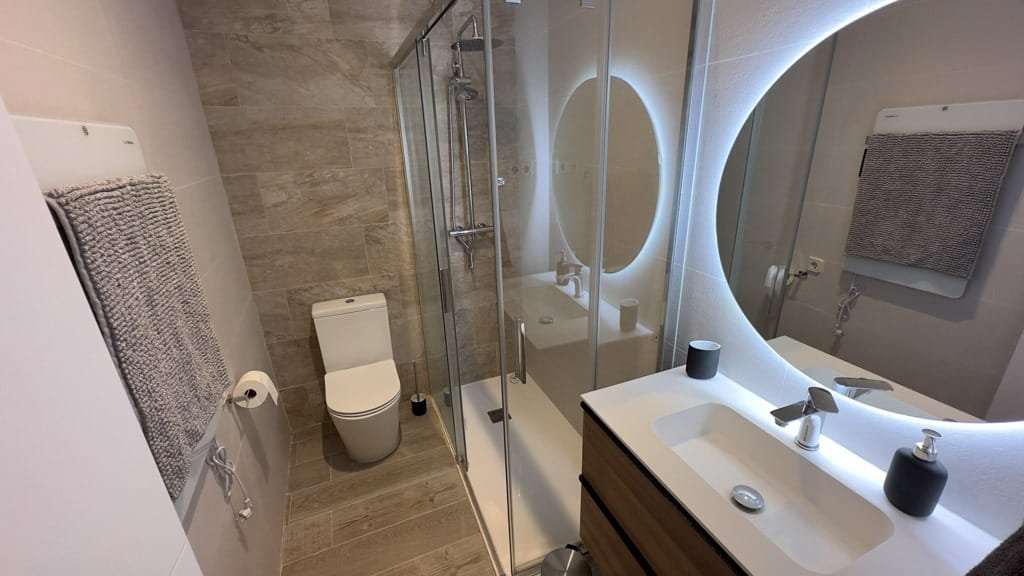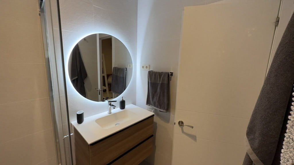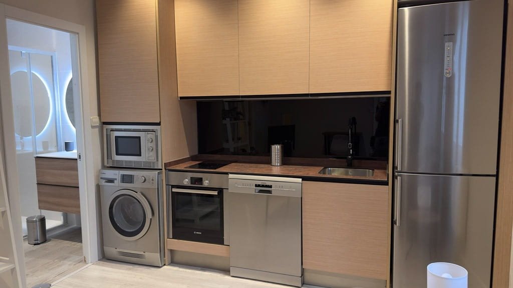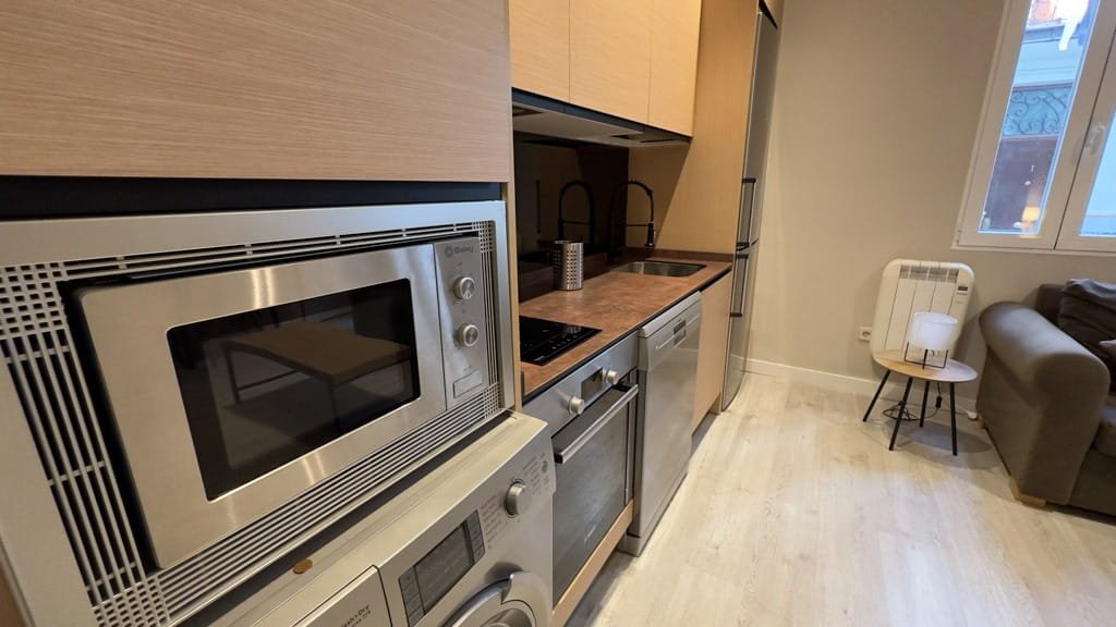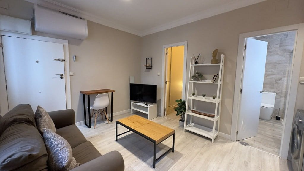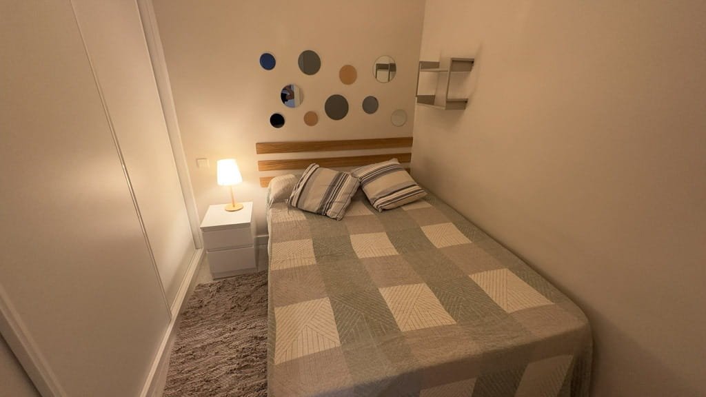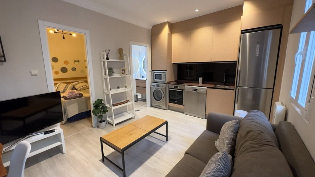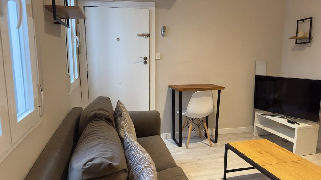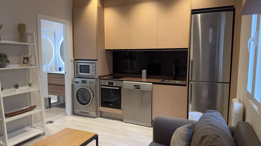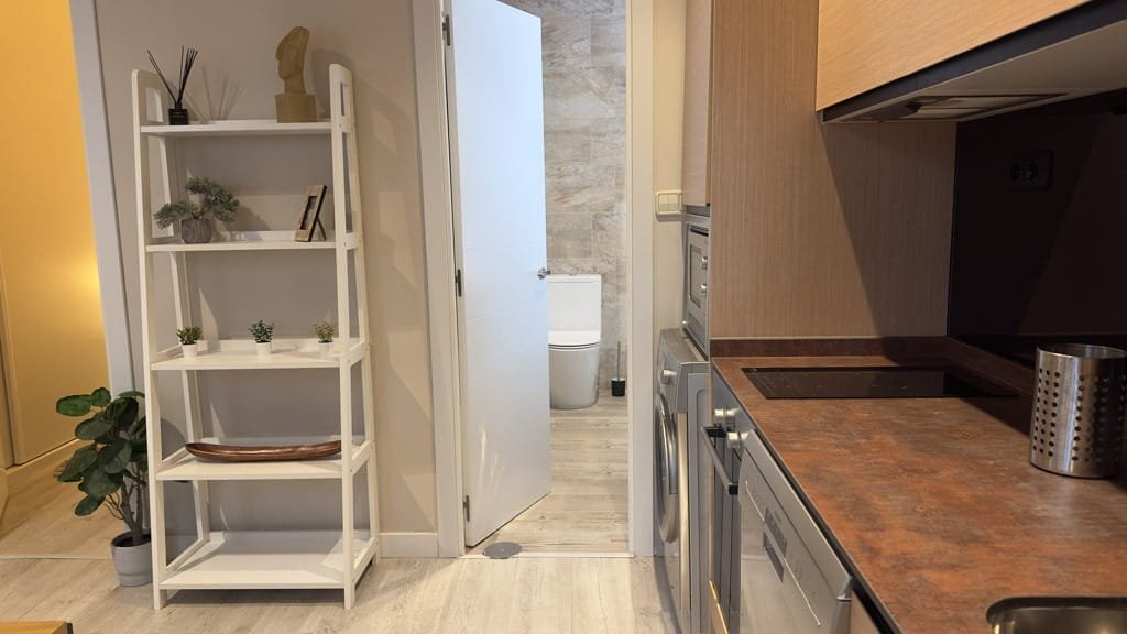 El piso dispone de un dormitorio independiente con cama doble y armarios empotrados, ofreciendo un espacio cómodo y funcional. El salón se integra con una moderna cocina americana equipada con electrodomésticos de acero inoxidable y menaje incluido, creando un ambiente práctico y acogedor para el día a día. El baño cuenta con una amplia ducha y espacios de almacenamiento que aportan mayor comodidad.