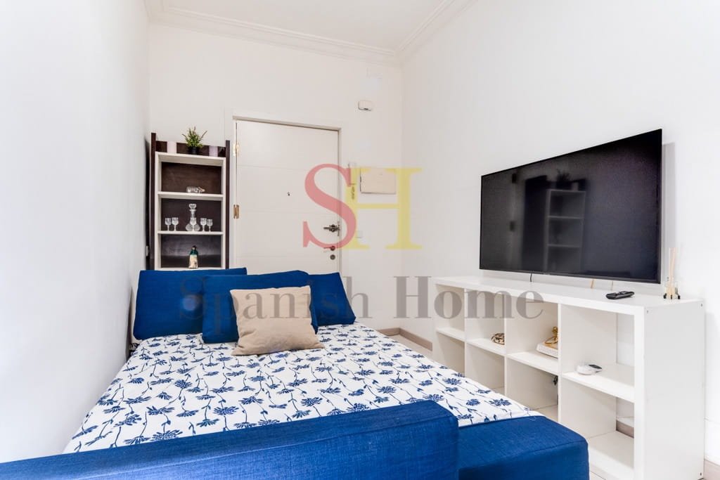 El apartamento cuenta con 1 habitación amplia y luminosa con ventana al patio interior, cama doble, tres amplios armarios, mesa de escritorio ideal para teletrabajo y una gran Smart TV. La puerta corrediza ofrece privacidad, ventilación y luz natural.