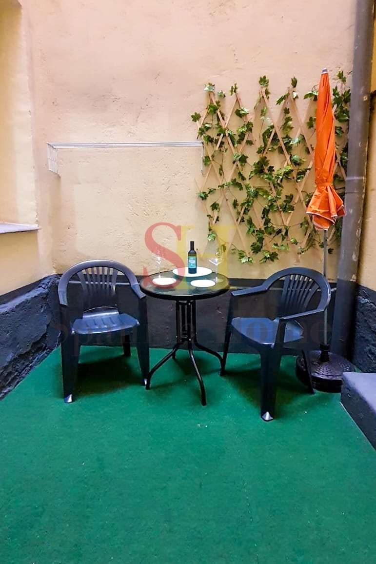 The property features 1 spacious, bright bedroom with a window facing the interior courtyard, a double bed, three large wardrobes, a desk ideal for remote work, and a large Smart TV. The sliding door ensures privacy, natural ventilation, and abundant light.