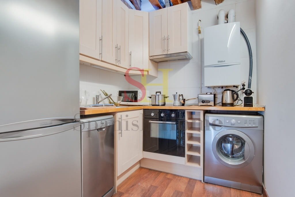 La cocina está totalmente equipada con nevera grande, lavavajillas, lavadora, vitrocerámica con horno, microondas y menaje completo, ideal para tu día a día.
