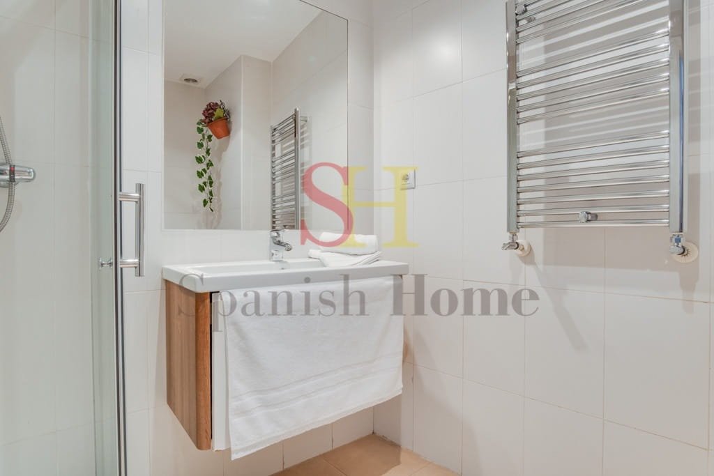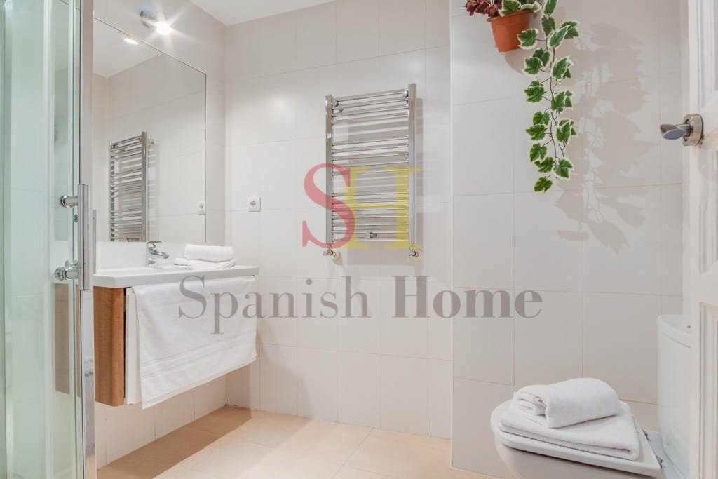 El baño es amplio y moderno, con plato de ducha, gran espejo y calentador de toallas, perfecto para los meses de invierno.
