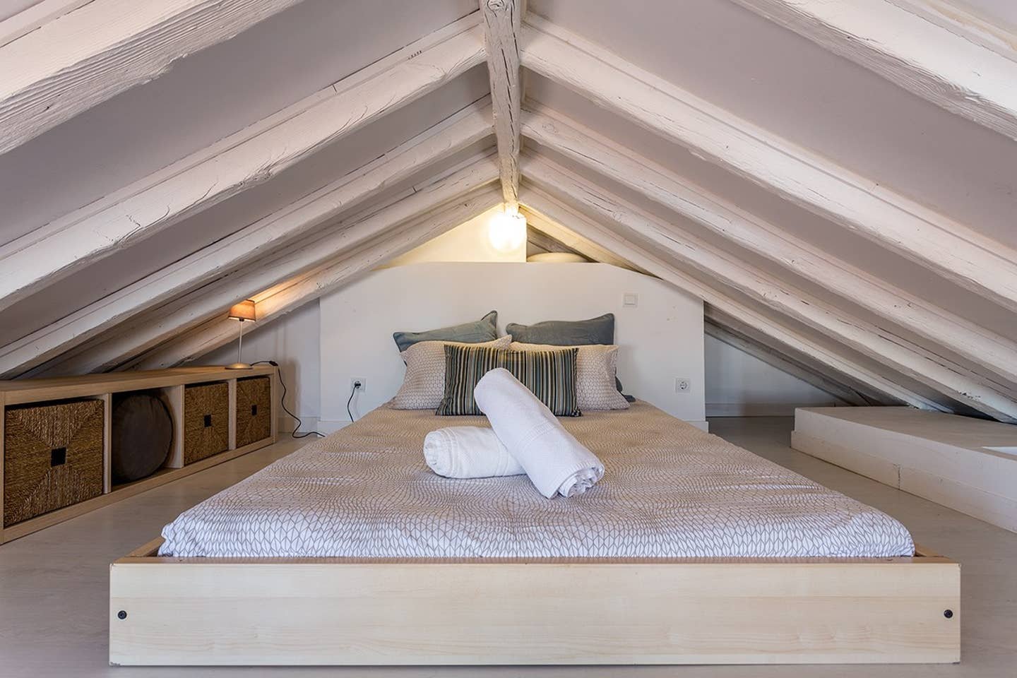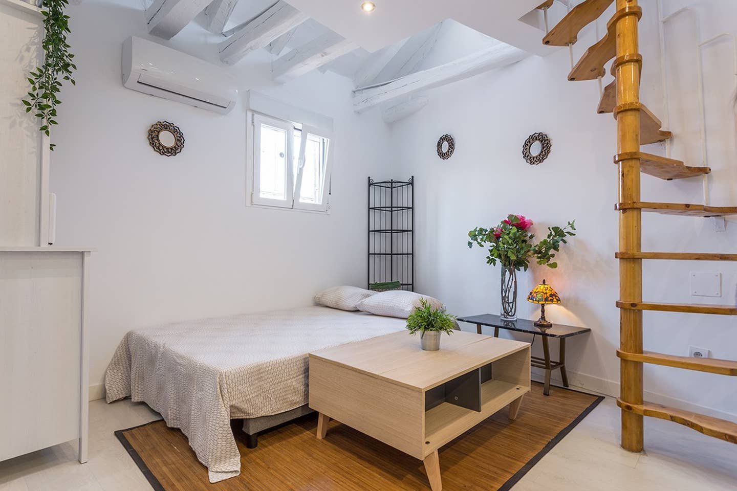 The bedroom is located on the upper level, creating a comfortable and private space ideal for couples, professionals, or students staying in Madrid. It features a 135 × 190 double bed, a chest of drawers, and a large wardrobe on the lower level, along with excellent ventilation and natural light connecting the sleeping area with the living room. The apartment also includes air conditioning and heating for year-round comfort.