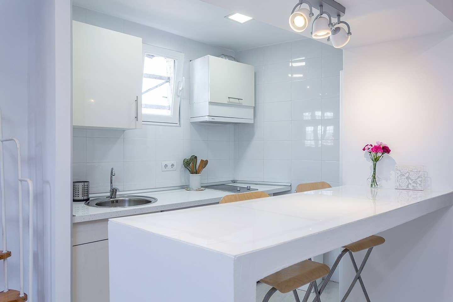 La cocina de estilo americano, recientemente reformada, está equipada con vitrocerámica, microondas y extractor, además de los electrodomésticos básicos que facilitan el día a día. Incluye también una barra tipo desayunador, ideal para comidas rápidas o momentos de relax.