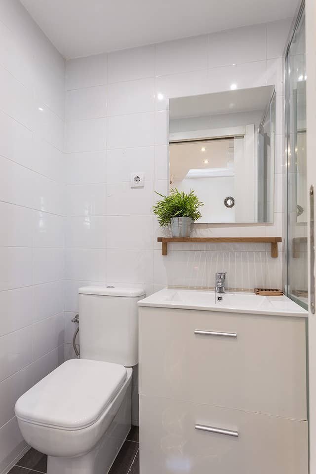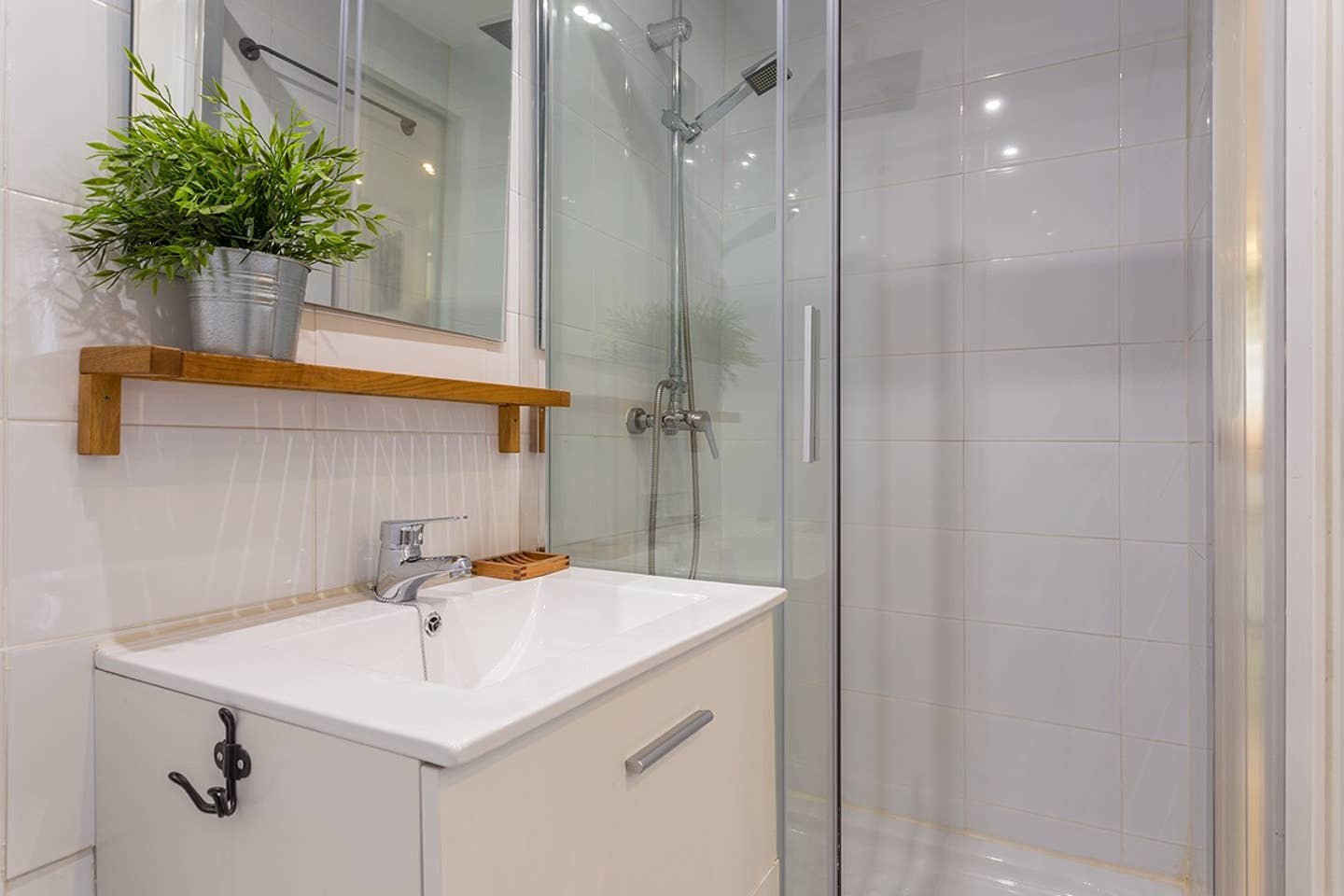 El baño es funcional y bien distribuido, con plato de ducha, espacios para organizar tus productos personales y un gran espejo que aporta luminosidad al ambiente.