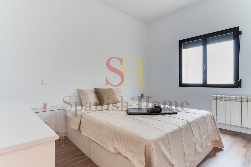 El piso dispone de un dormitorio amplio y luminoso, con ventana hacia el patio interior. Cuenta con una cama doble canapé de 180 × 190 cm, cajonera, mesillas de noche de estilo moderno y un amplio armario empotrado con puertas correderas. Este diseño permite mantener privacidad mientras se conserva la ventilación y la luz natural entre el salón y el área de descanso.